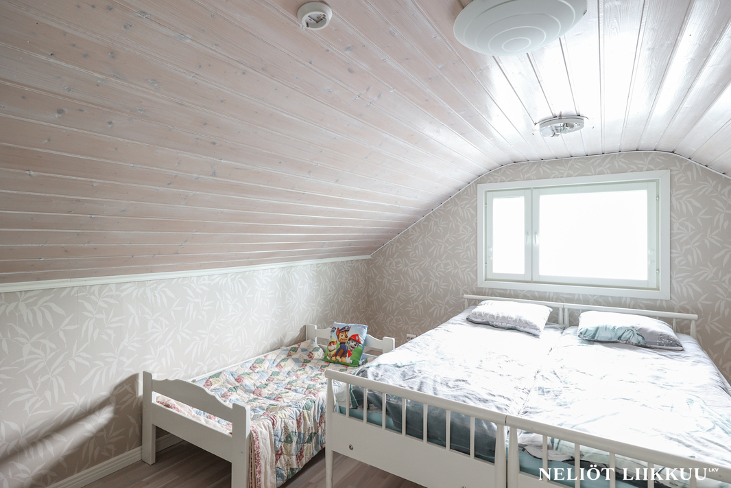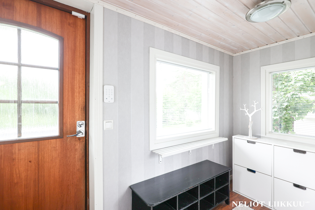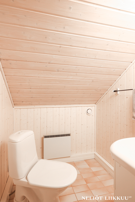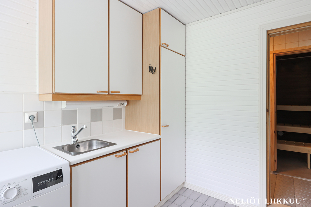 Tässä kodissa on kaksi makuuhuonetta, keittiö, kodinhoitohuone, kylpyhuone, sauna, kaksi erillistä wc:tä sekä kuisti.