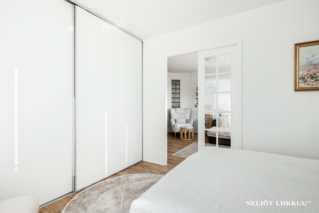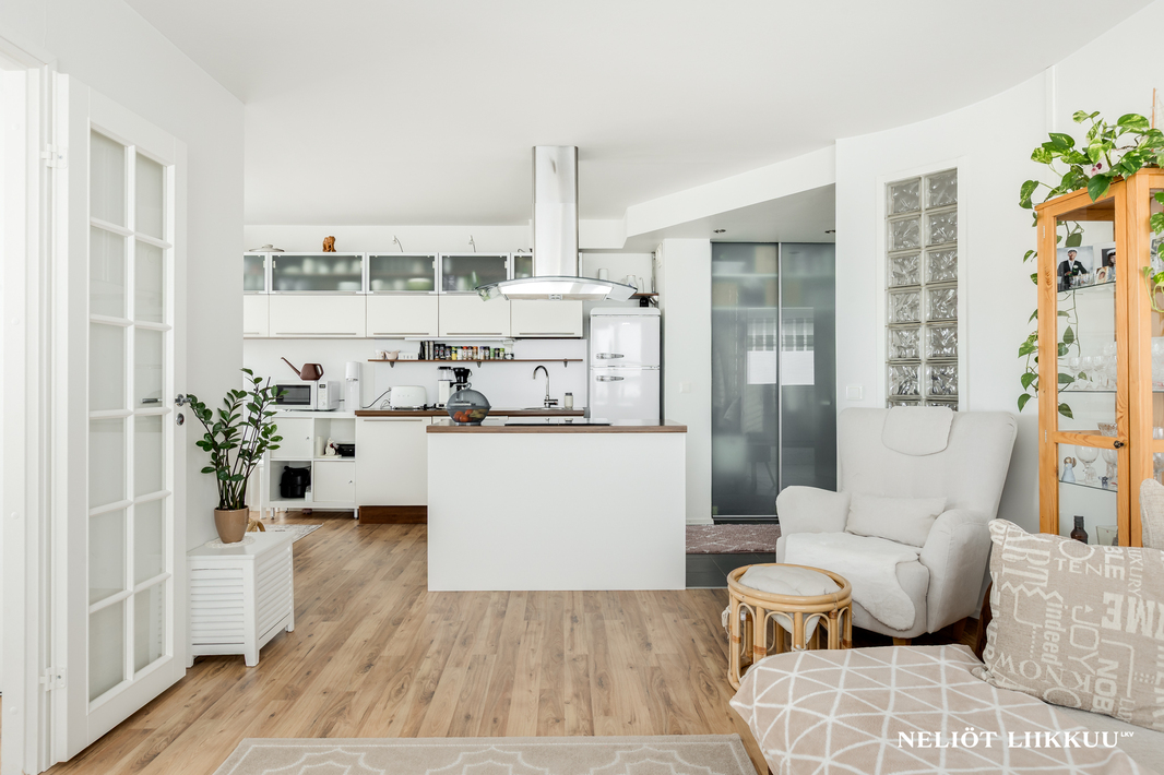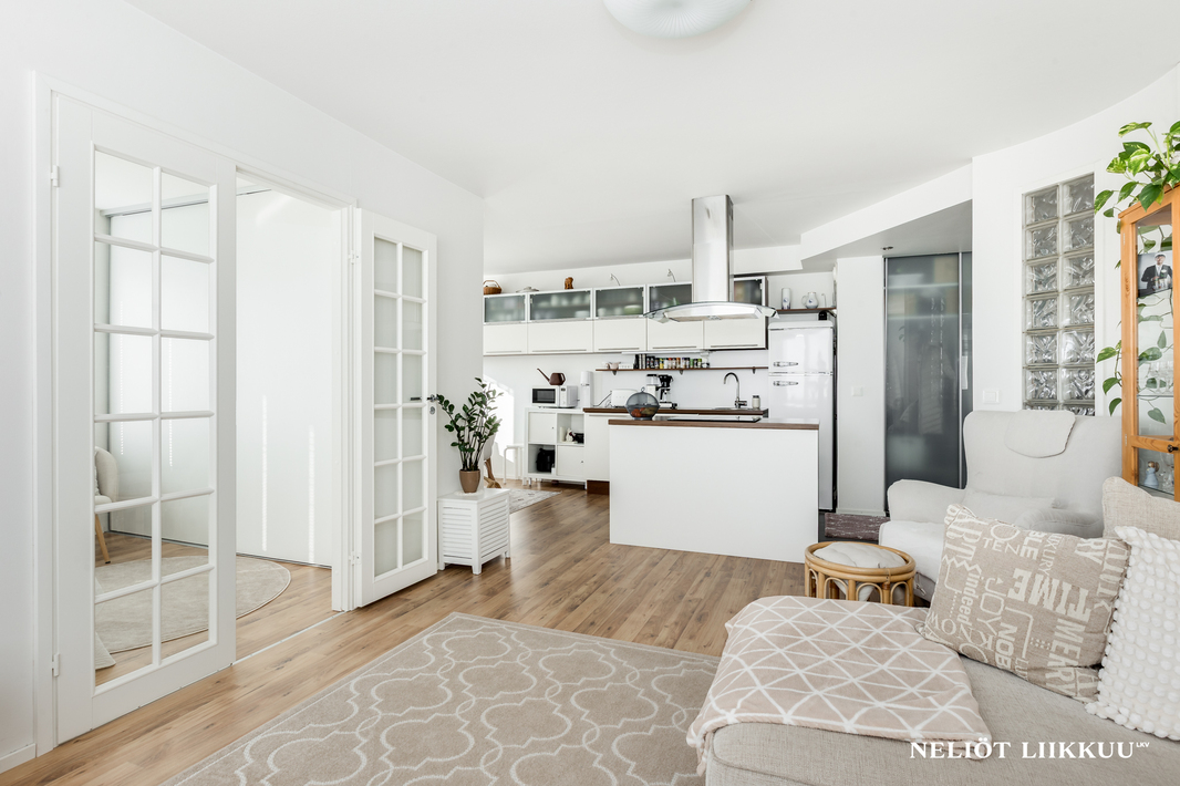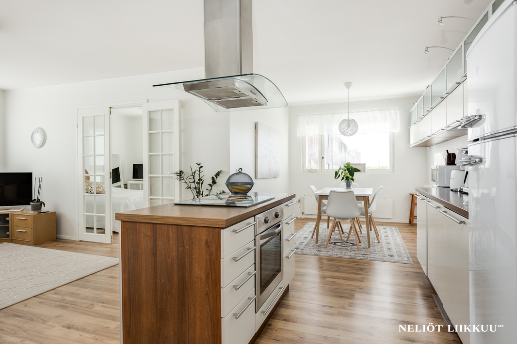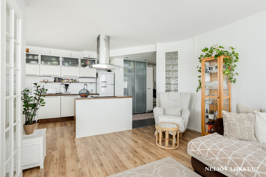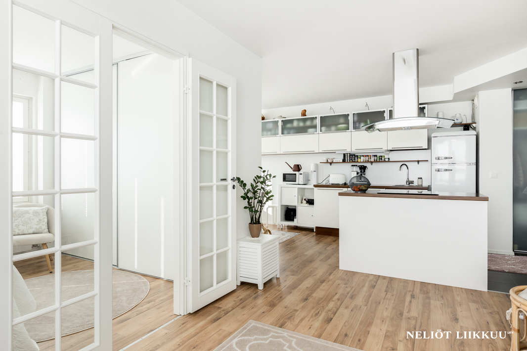 Keittiö on avattu mukavasti saarekkeen avulla ja tilat yhdistyvät olohuoneen kanssa saumattomasti toisiinsa. Kaksi makuuhuonetta ovat hyvänkokoisia ja molemmista löytyy liukuovikaapistot. Päämakuuhuoneen ranskalainen parveke tarjoaa mahdollisuuden nauttia myös ulkoilmasta.