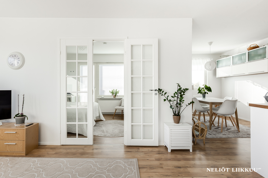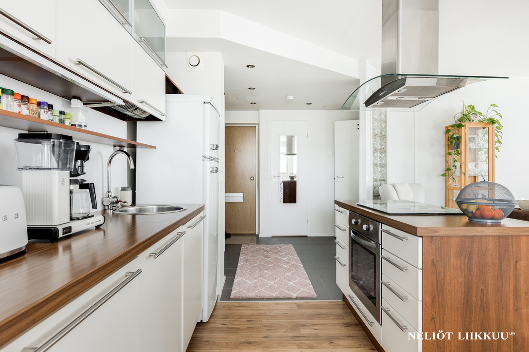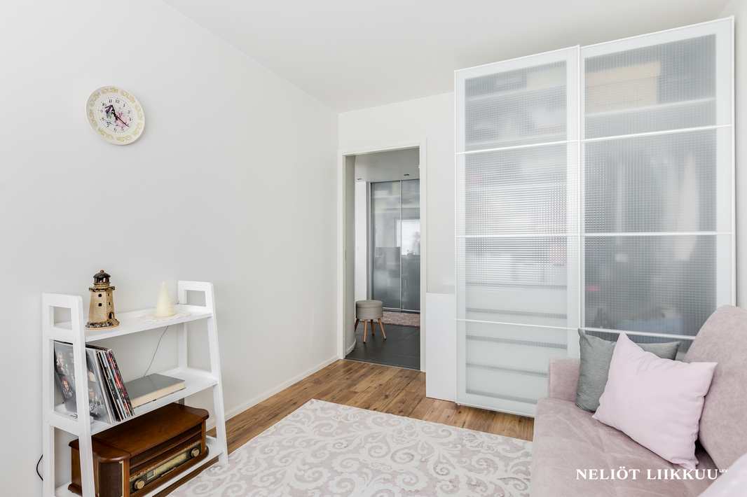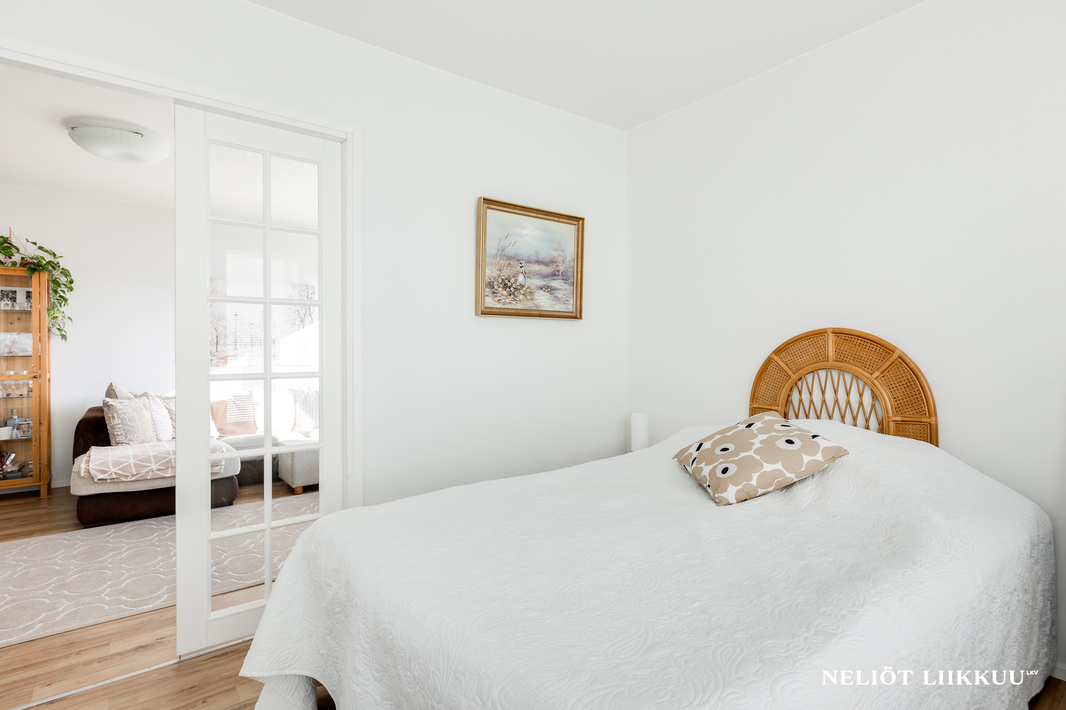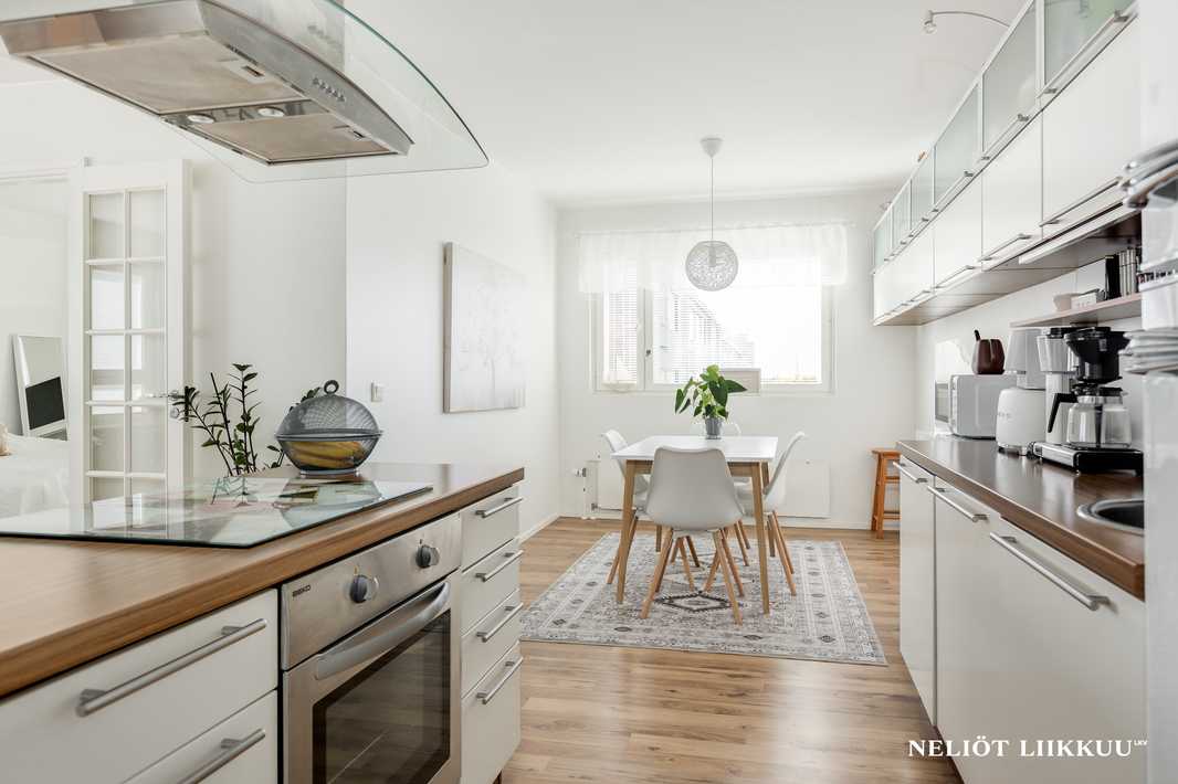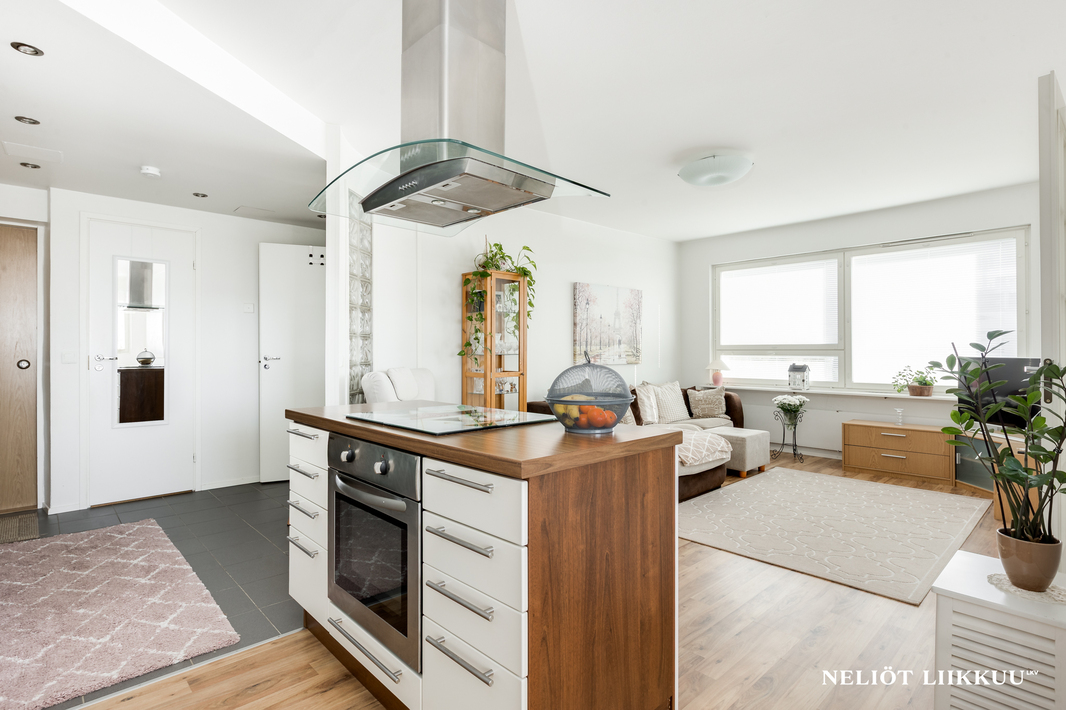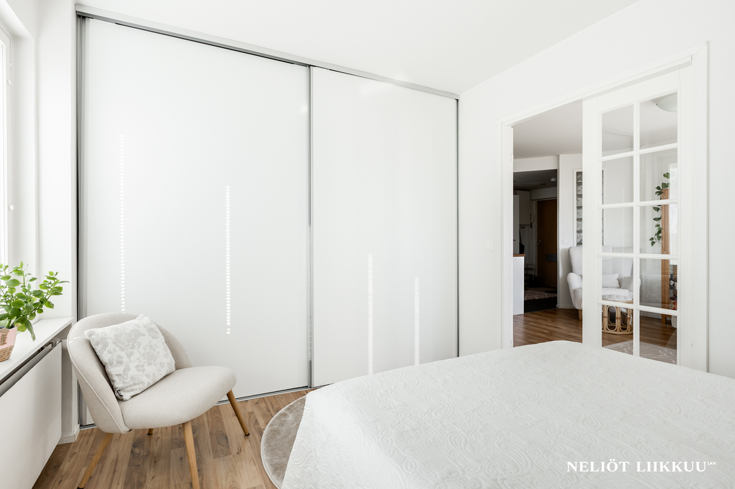 Keittiö on avattu mukavasti saarekkeen avulla ja tilat yhdistyvät olohuoneen kanssa saumattomasti toisiinsa. Kaksi makuuhuonetta ovat hyvänkokoisia ja molemmista löytyy liukuovikaapistot. Päämakuuhuoneen ranskalainen parveke tarjoaa mahdollisuuden nauttia myös ulkoilmasta.