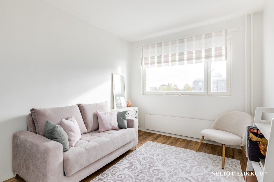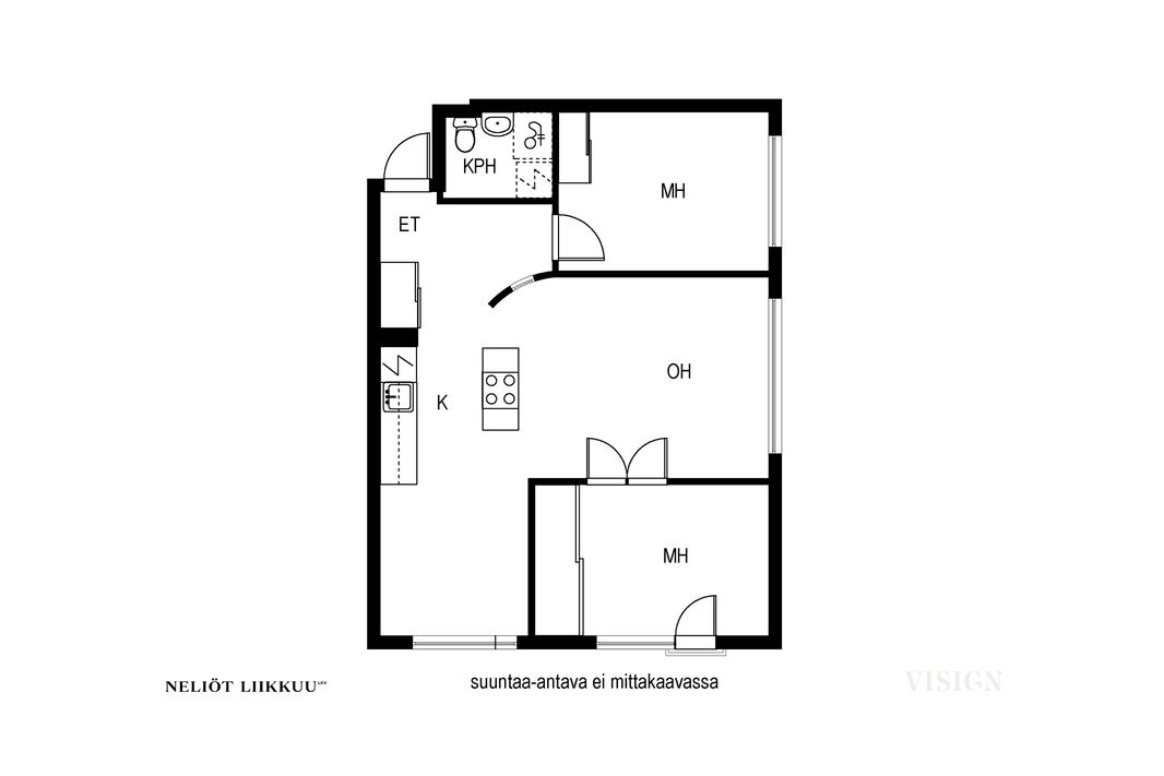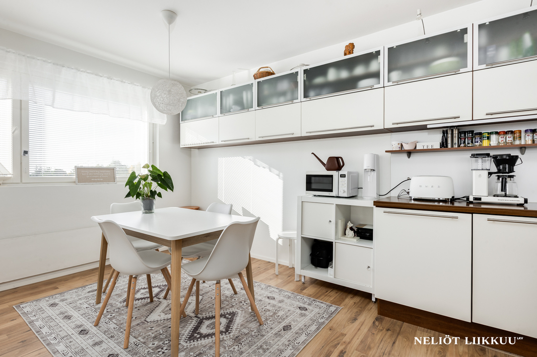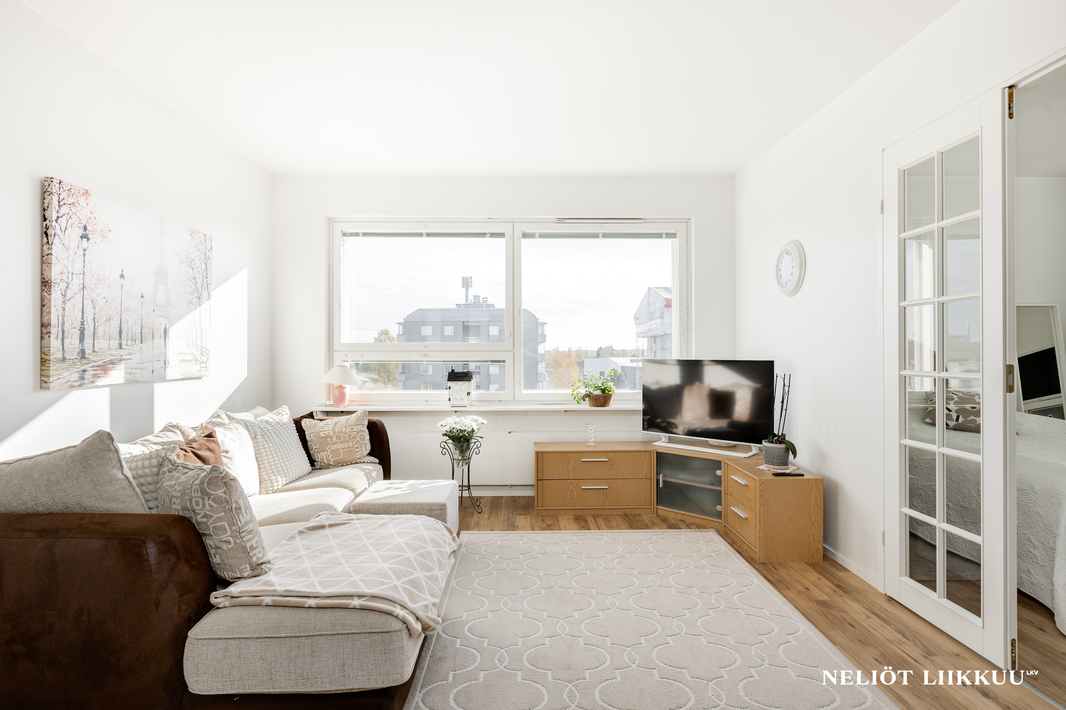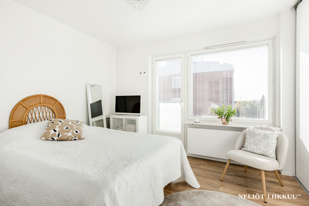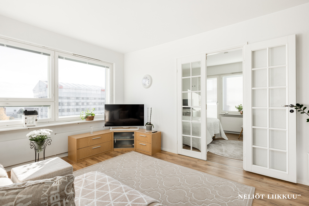 Keittiö on avattu mukavasti saarekkeen avulla ja tilat yhdistyvät olohuoneen kanssa saumattomasti toisiinsa. Kaksi makuuhuonetta ovat hyvänkokoisia ja molemmista löytyy liukuovikaapistot. Päämakuuhuoneen ranskalainen parveke tarjoaa mahdollisuuden nauttia myös ulkoilmasta.