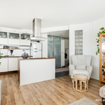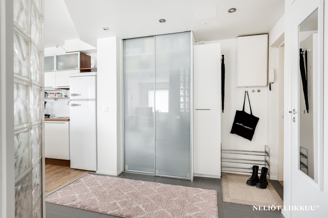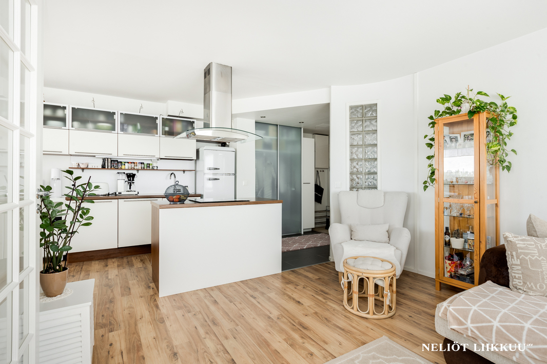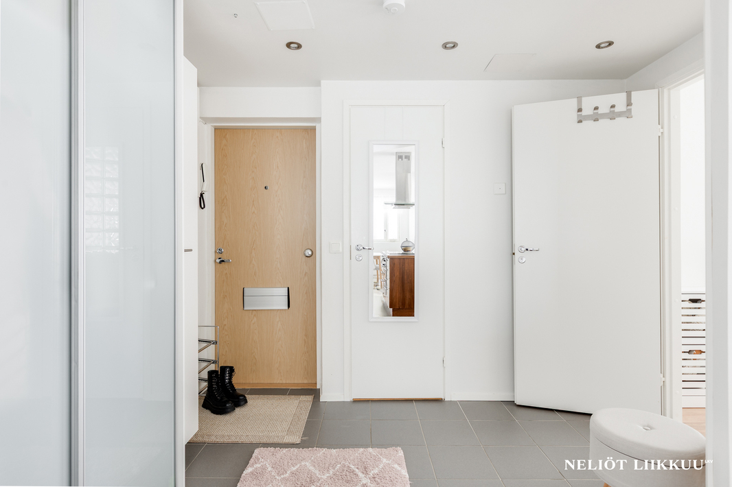 Tätä kotia on päivitetty kauttaaltaan kotoisaksi ja se hurmaa harmonisuudellaan. Eteisaulasta silmiisi avautuu kodin kaikki tilat kerralla, mikä tekee tästä kodista ihastuttavan. Aulan laatoitettu lattia ottaa vastaan kurakenkäisetkin tulijat ja liukuovien taakse kaapistoon saat kätkettyä ulkovaatteet. Eteisen kaareva seinänpätkä lasitiilineen tuo omaleimaisuutta kotiin.