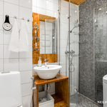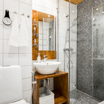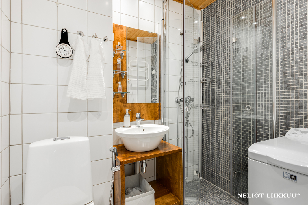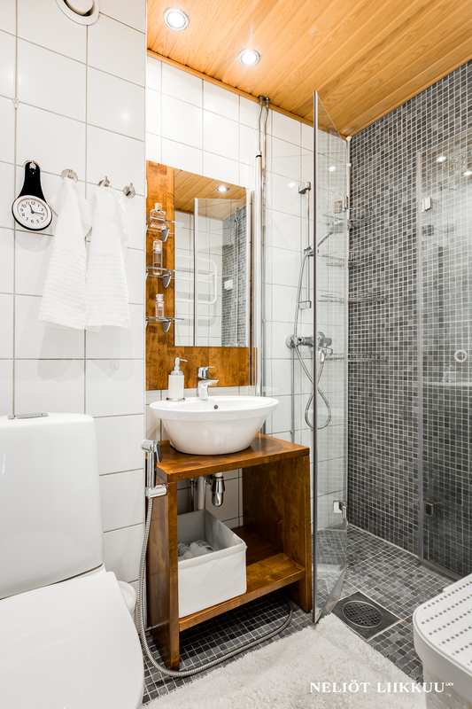 | Kylpyhuoneen kuvaus | Harmaa mosaiikkilaatta lattiassa. Seinissä valkoiset kaakelit ja tehosteseinänä sama harmaa mosaiikkilaatta kuin lattiassa. Kääntyvät ja taittuvat lasiset suihkuseinät. Allaskaluste. Pyöreä tasoallas. Peili ja lasiset seinähyllyt. Wc-istuin. Bideesuihku. Sähköinen pyyhekuivain. Pyykinpesukoneliitäntä. |