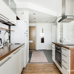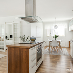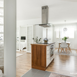 | Keittiön varustelu | Lämminhenkinen keittiö saarekkeella. Runsaasti säilytystilaa. Vaaleat kaapistot. Pähkinänsävyiset tasot ja rungot. Saarekkeessa keraaminen liesi. Erillisuuni. Liesituuletin (koneellinen poisto). Jenkkityylinen jääkaappipakastin. Integroitu astianpesukone. |