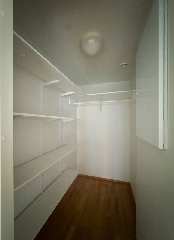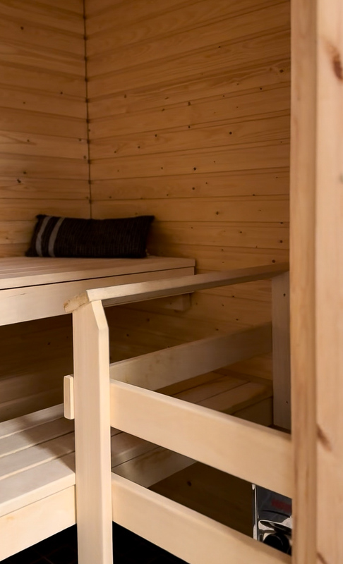 Oma sauna tarjoaa arjen luksusta, ja säilytystilaa on reilusti kaapistojen sekä tilavan vaatehuoneen ansiosta.