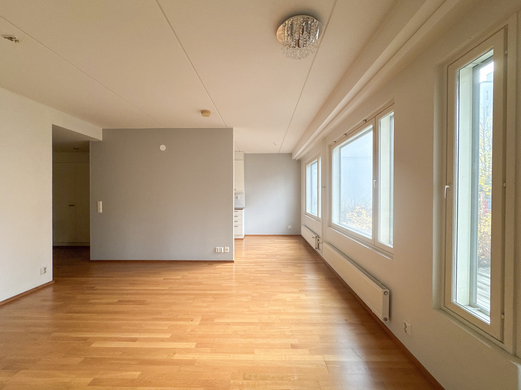 Asunnossa on hyvin suunniteltu pohjaratkaisu. Tilava olohuone kutsuu viihtymään, ja sieltä terassille, joka toimii ylimääräisenä oleskelutilana aikaisesta keväästä pitkälle syksyyn.