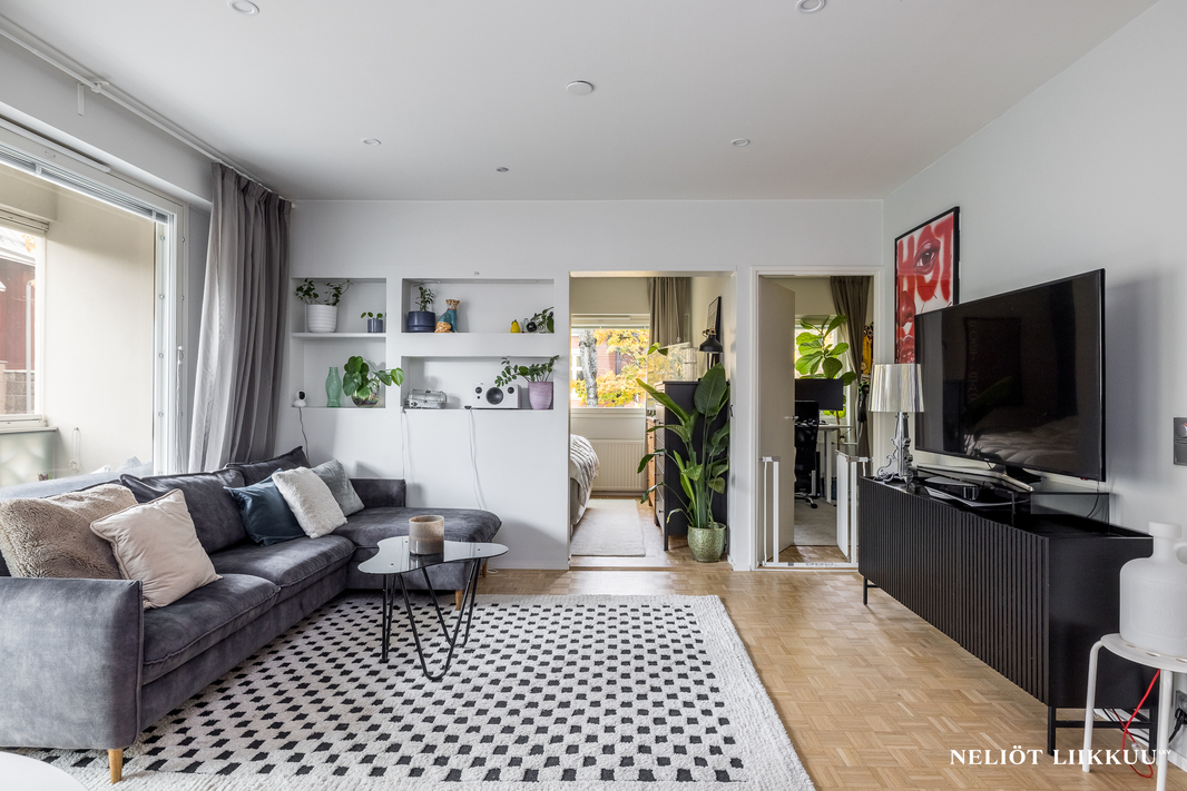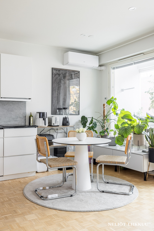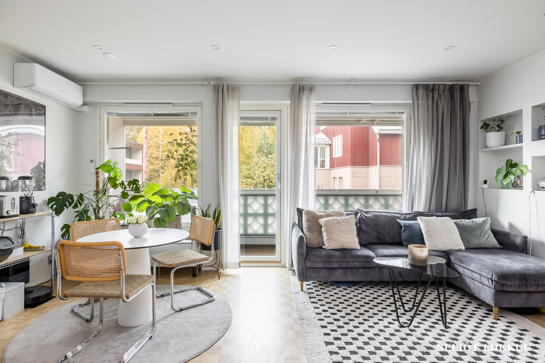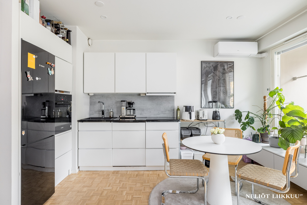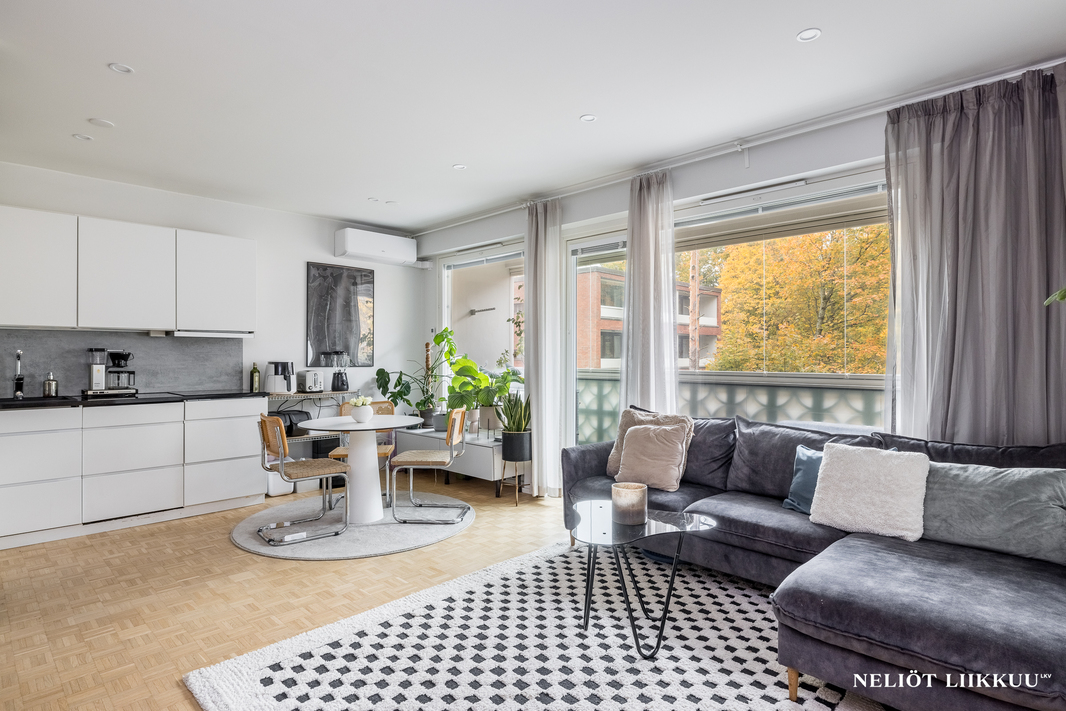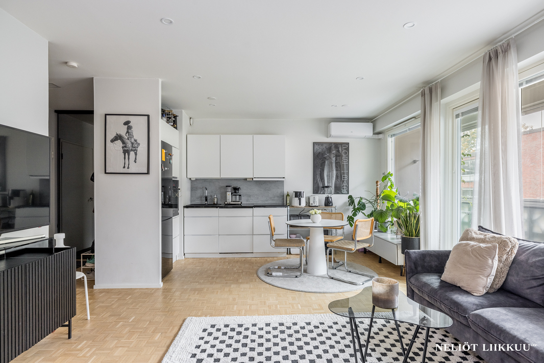 Tämä kauniisti remontoitu koti tarjoaa erinomaisen pohjaratkaisun, jossa jokainen neliö on tehokkaassa käytössä. Tyylikäs avokeittiö yhdistyy valoisaan olohuoneeseen, ja keittiön edustalla on hyvin tilaa isommallekin ruokailuryhmälle.