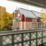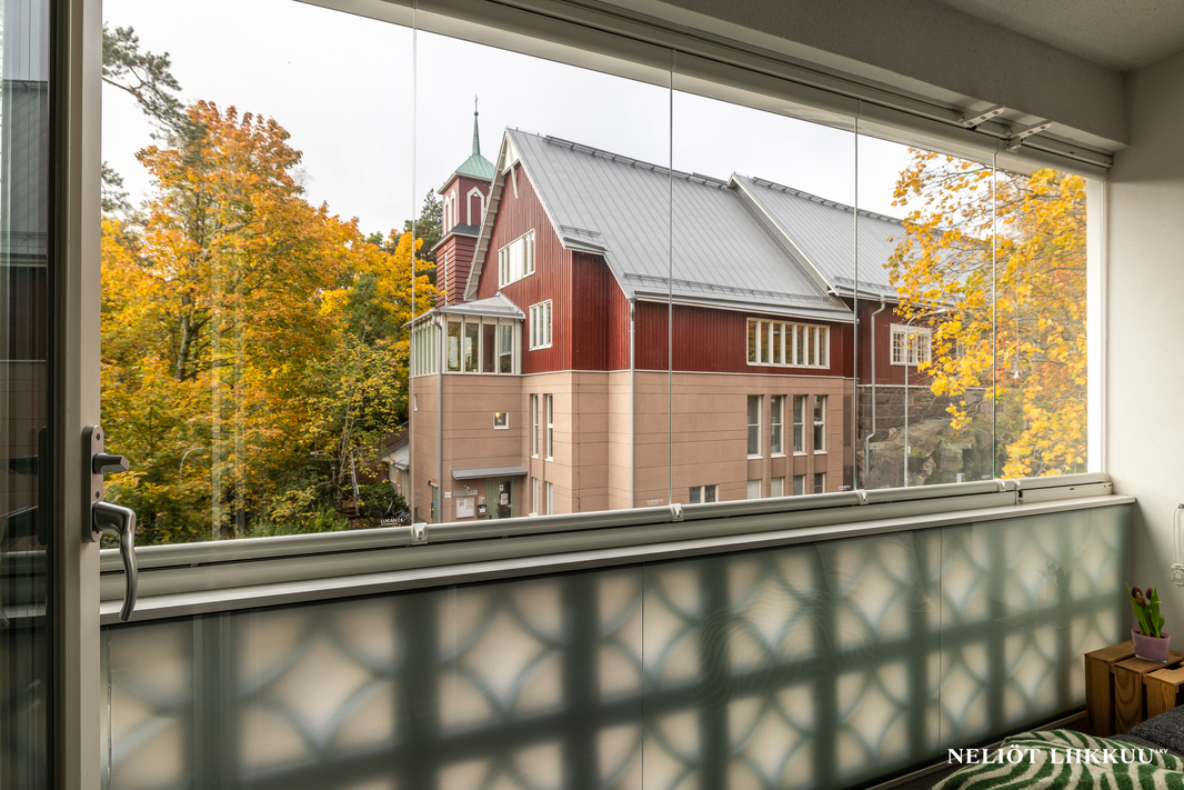 Olohuoneesta on käynti suurelle lasitetulle parvekkeelle, josta avautuvat kauniit näkymät kirkolle päin – täydellinen paikka nauttia auringosta ja rauhallisesta ympäristöstä.