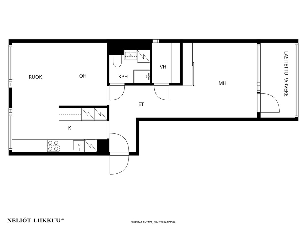 | Huoneistoselitelmä | 2h, k, kph, vh, lasitettu parveke (yhtiöjärjestyksen mukaan 2h+k) |