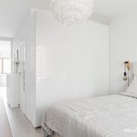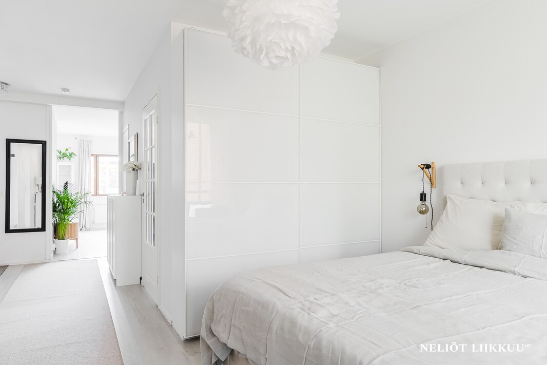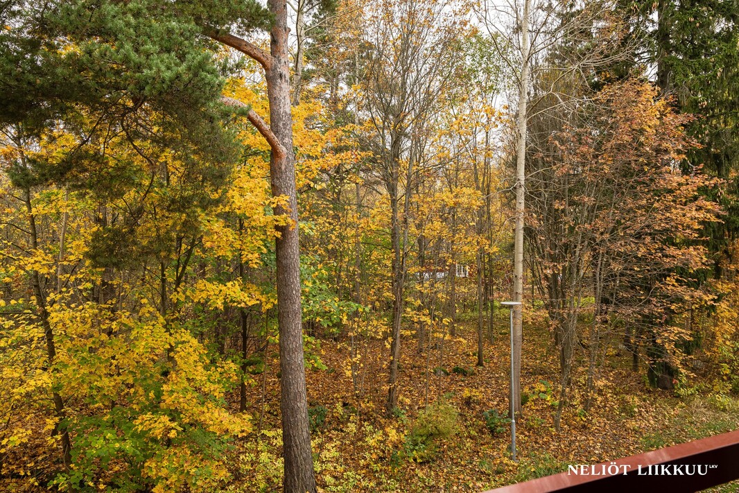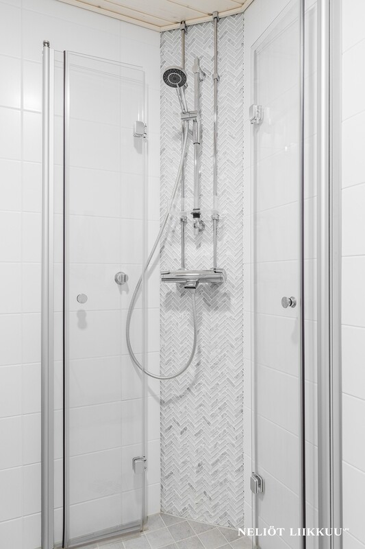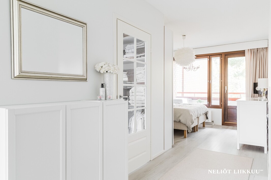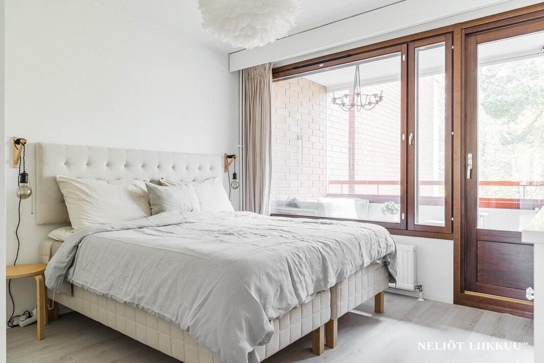 Putkiremontin yhteydessä uusittu kylpyhuone on toteutettu ajattomilla materiaaleilla ja sinne mahtuu hyvin myös pesutorni. Säilytystilaa on myös runsaasti vaatehuoneen ja makuuhuoneen liukuovikaapiston ansiosta. Makuuhuoneesta on käynti lasitetulle, luoteeseen suuntautuvalle parvekkeelle, josta avautuvat rauhalliset ja vehreät metsämaisemat. Tämä on täydellinen paikka nauttia lämpimistä päivistä.
