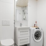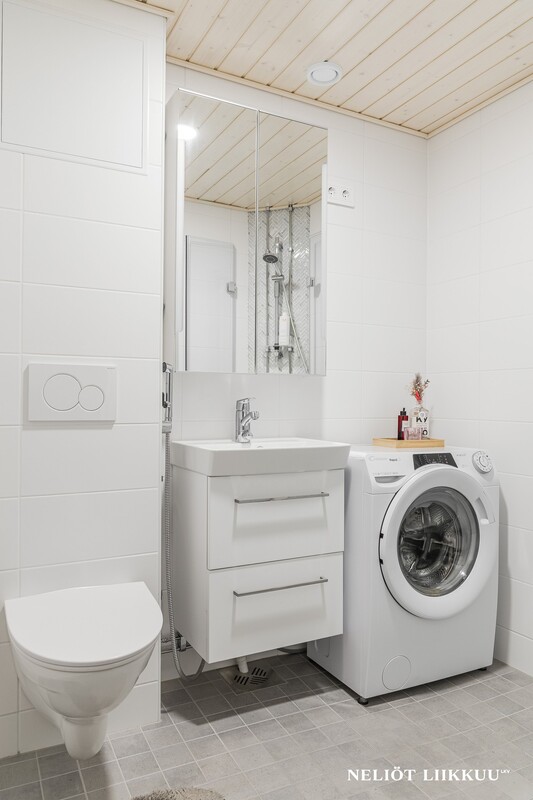 | Kylpyhuoneen kuvaus | Varustus: Suihku, suihku taitto-ovet, peilikaappi, allaskaappi, seinä wc-istuin, bidee-suihku, pesukoneliitäntä, lattialämmitys, kiinteät valaisimet |