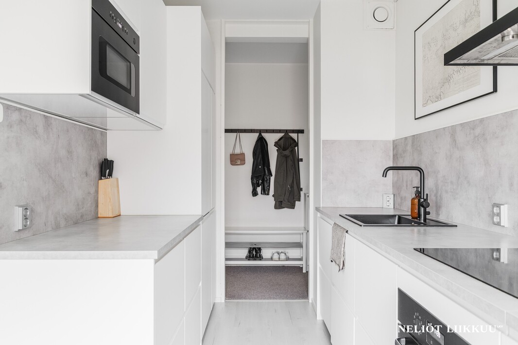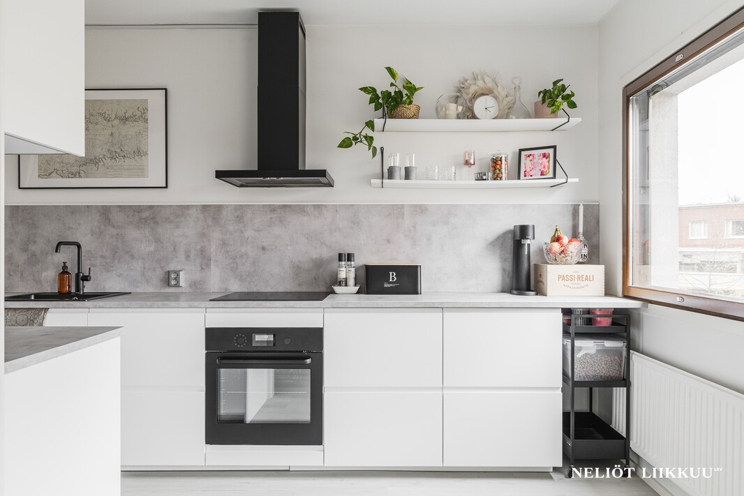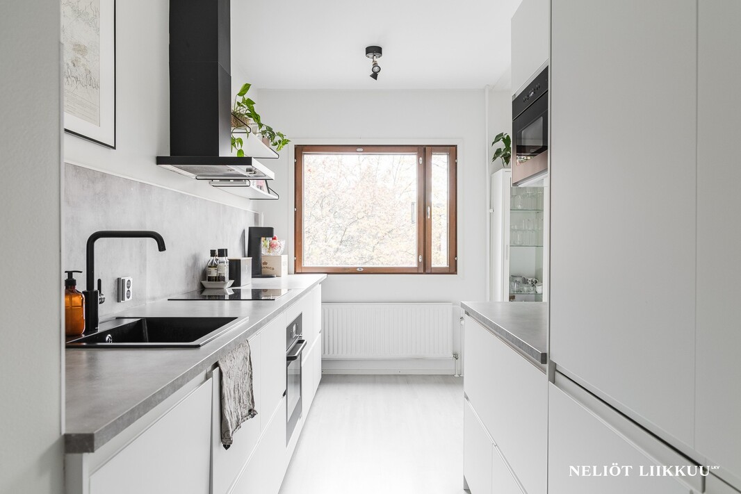 Asunnossa on erinomainen läpitalon pohjaratkaisu. Keväällä 2019 uusittu keittiö hurmaa modernilla ilmeellään ja integroiduilla kodinkoneillaan. Keittiön ja olohuoneen välistä seinää on avattu, mikä tekee tilasta käytännöllisen ja valoisan. Samalla on tehty vaatehuone, asennettu laminaatti lattia ja päivitetty pintoja.