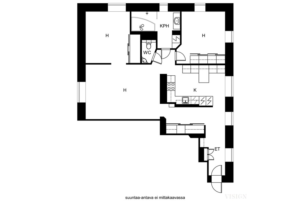 Huoneisto käsittää kaksi makuuhuonetta, tilavan olohuoneen, keittiön, kylpyhuoneen ja erillisen wc:n.