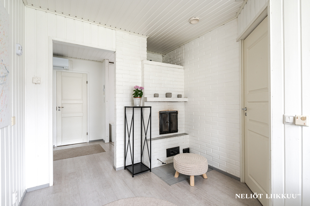 Kaksi vaatehuonetta ja lämmin ulkovarasto tuovat runsaasti säilytystilaa. Lisäksi käytössäsi on autotalli ja erillinen varasto.