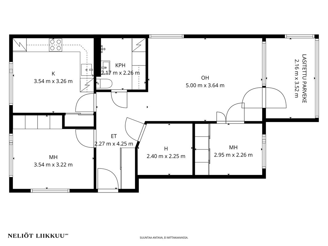 | Huoneistoselitelmä | 3h, k, vh, kph, lasitettu parveke (yj:n mukaan 3h+k) |