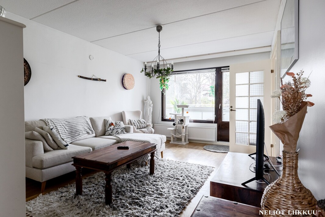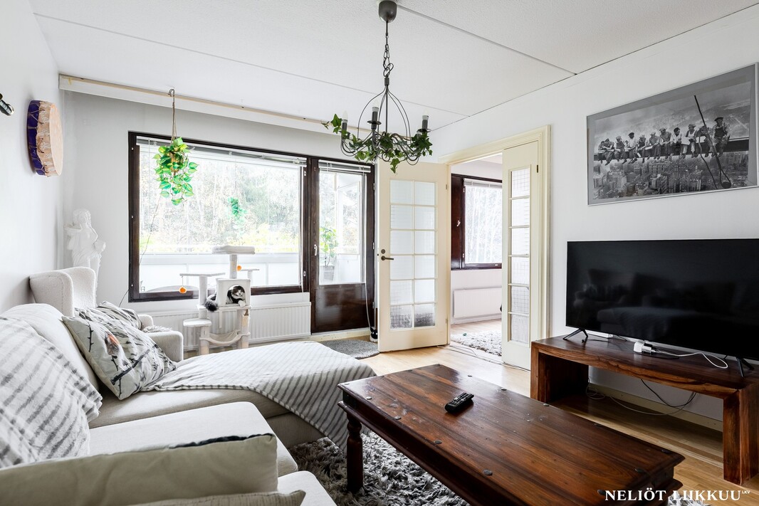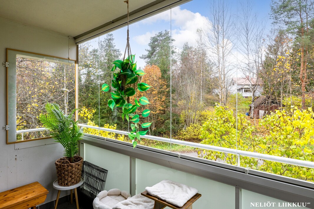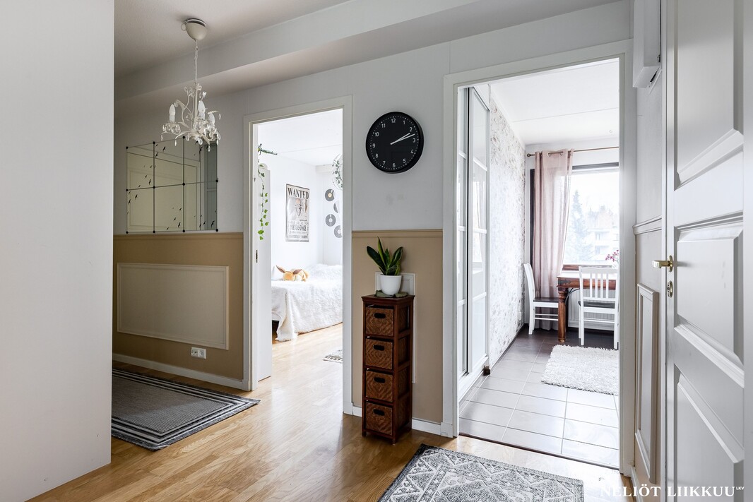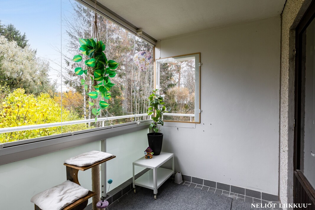 Olohuone on avara ja sen yhteydessä on lasitettu parveke, joka tuo mukavasti lisätilaa oleskeluun keväästä syksyyn. Keittiö on erillinen ja tilava, kaappi- ja laskutilaa on reilusti, joten kokkaaminen sujuu vaivattomasti.