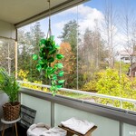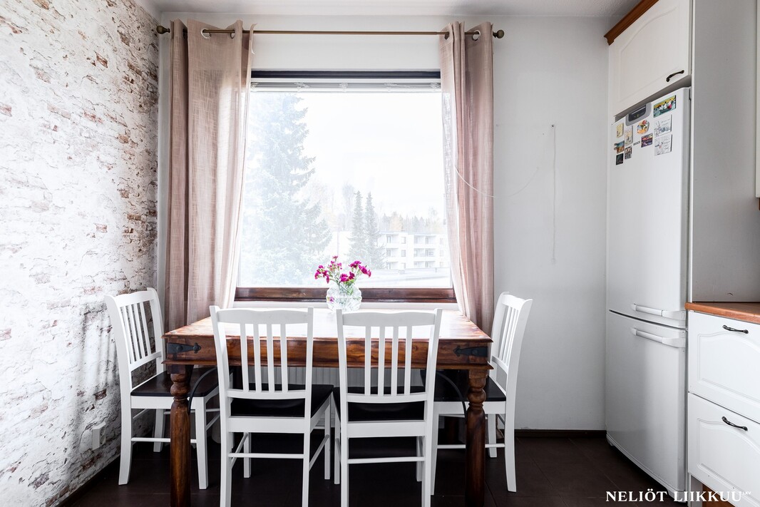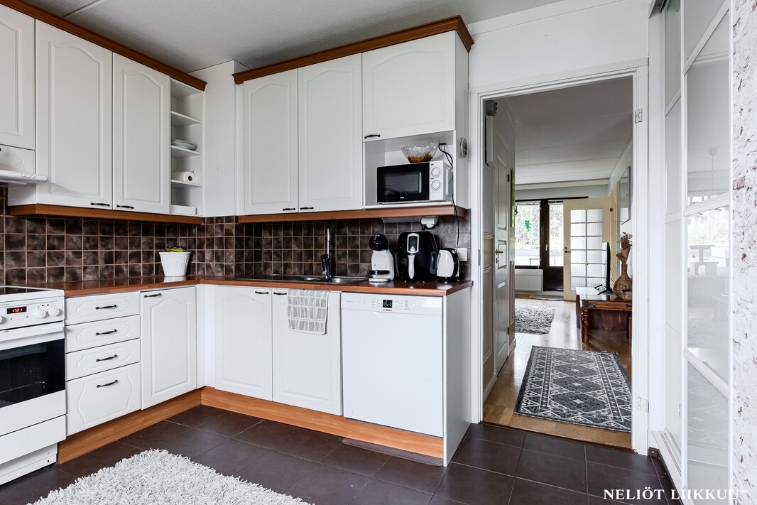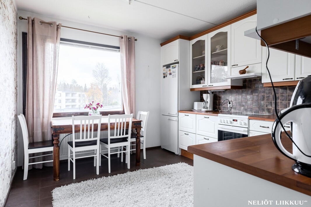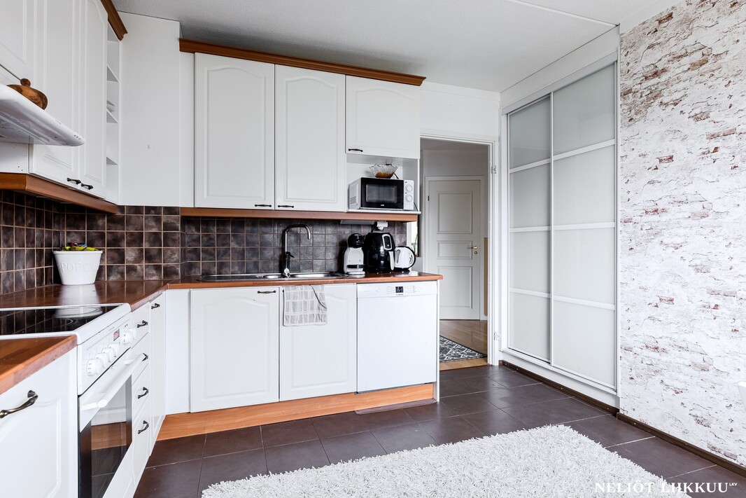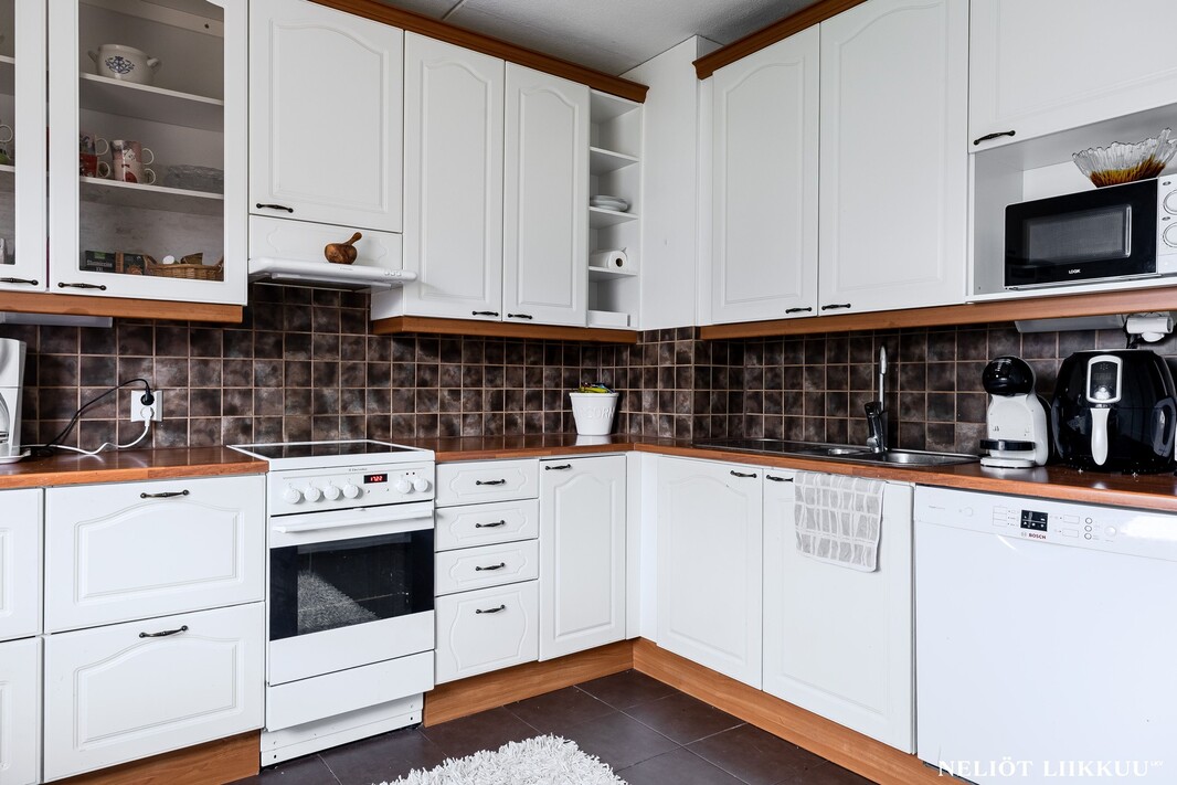Olohuone on avara ja sen yhteydessä on lasitettu parveke, joka tuo mukavasti lisätilaa oleskeluun keväästä syksyyn. Keittiö on erillinen ja tilava, kaappi- ja laskutilaa on reilusti, joten kokkaaminen sujuu vaivattomasti.