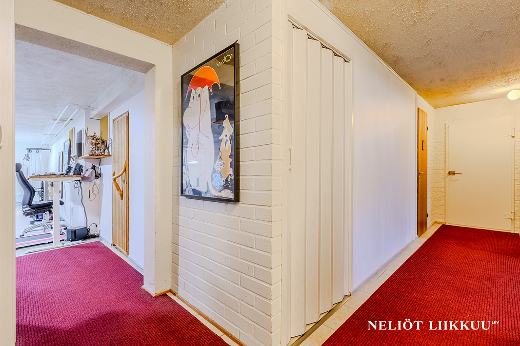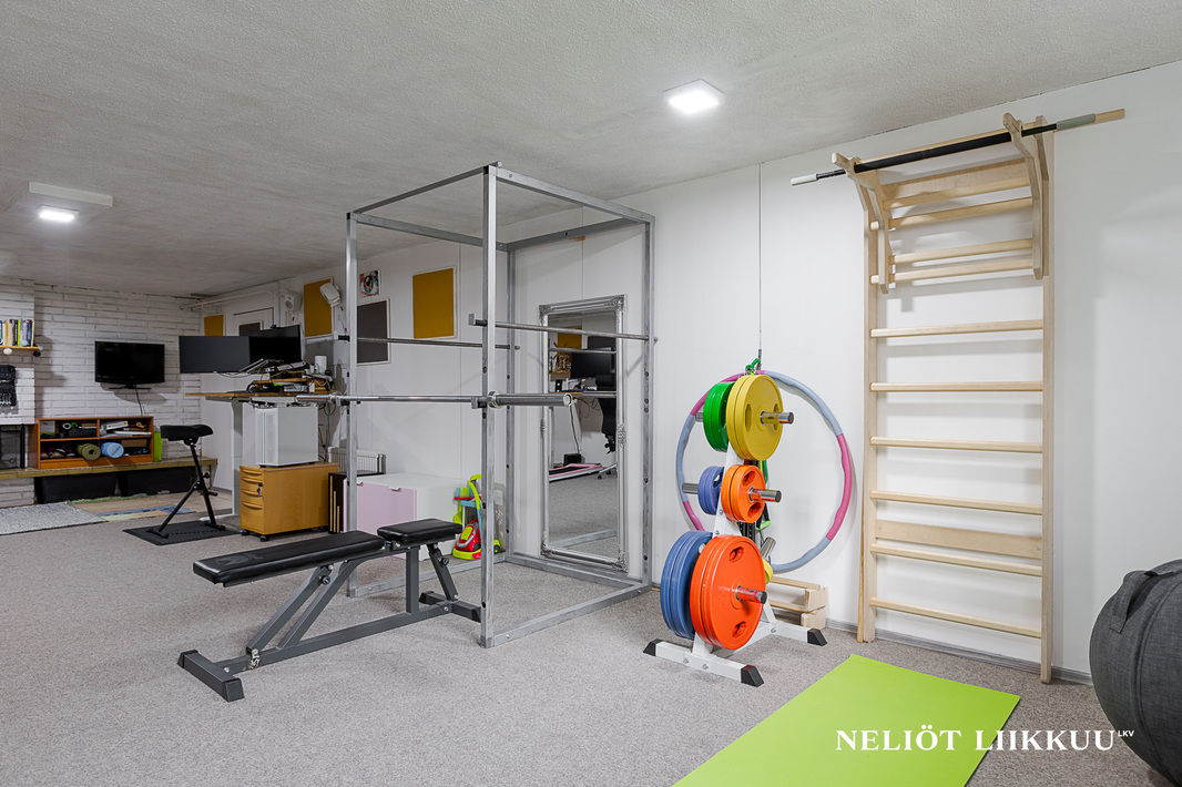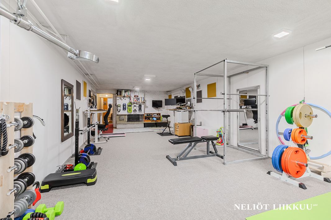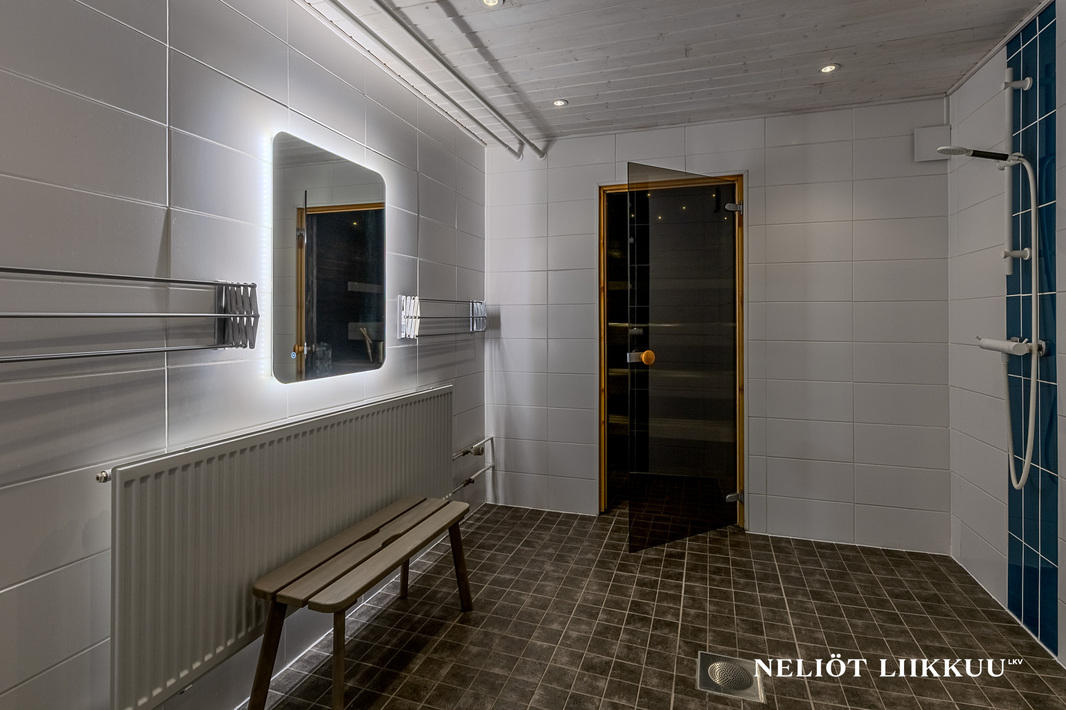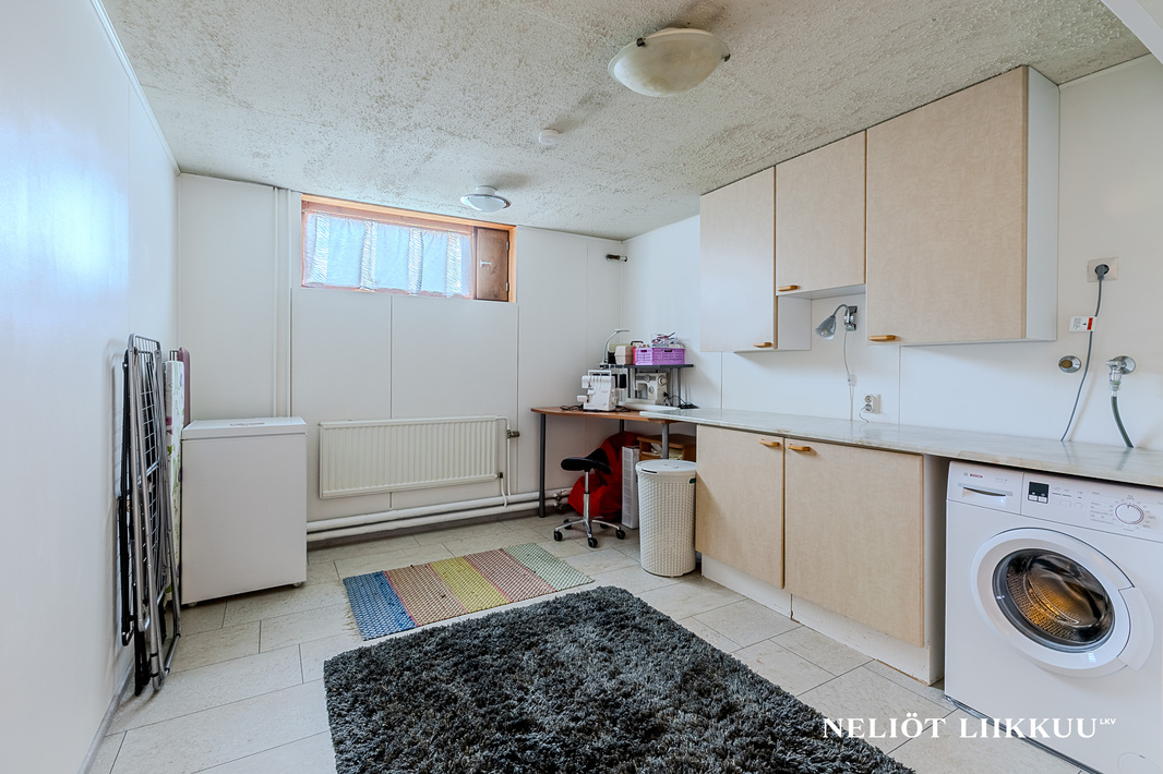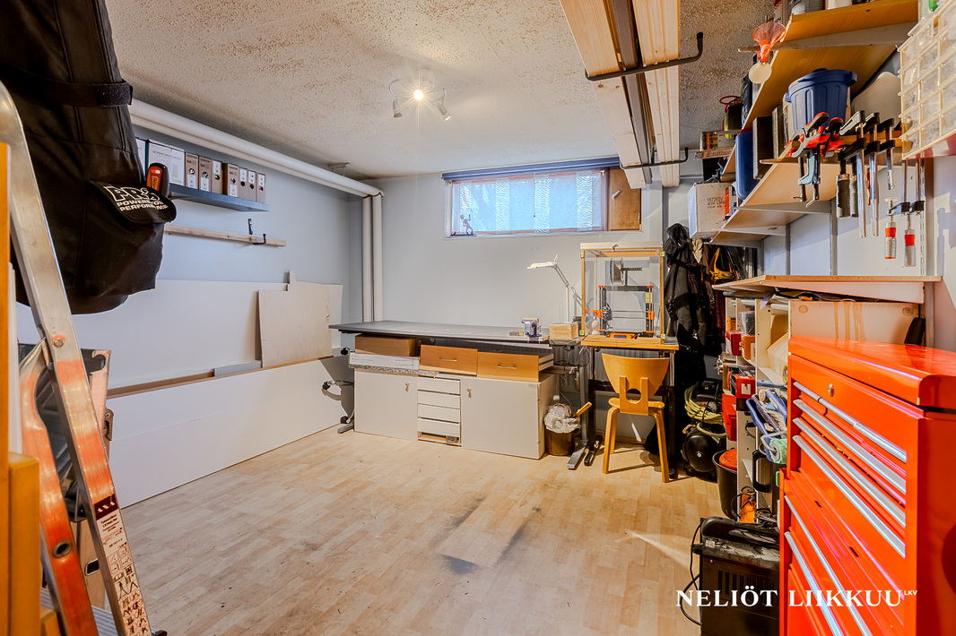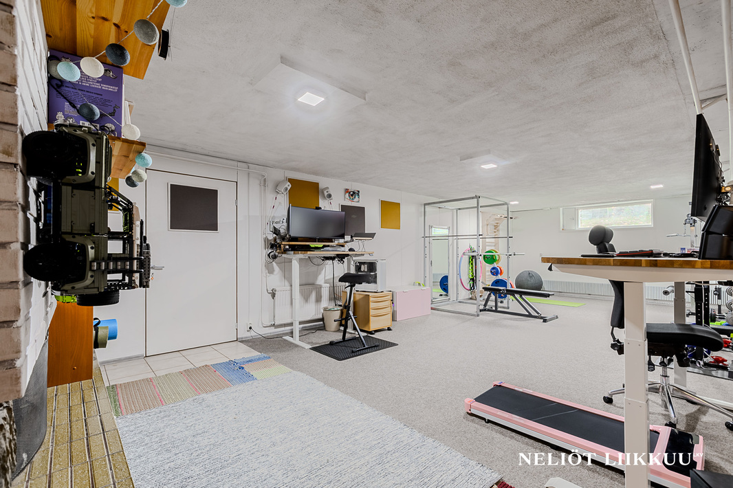Asuinneliöitä on 128 m², ja lisäksi alakerran kellaritilat tarjoavat runsaasti lisätilaa elämiseen ja harrastamiseen. Takkahuone, saunatilat, kylpyhuone, toinen wc, askarteluhuone, kodinhoitohuone, tekninen tila sekä varasto, täydellinen esimerkiksi harrastuksiin, työskentelyyn tai oleskeluun. Näitä tiloja ei lasketa virallisiin asuinneliöihin, mutta ne tuovat arkeen joustavuutta ja vaihtoehtoja.
