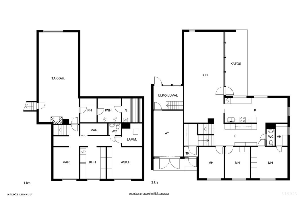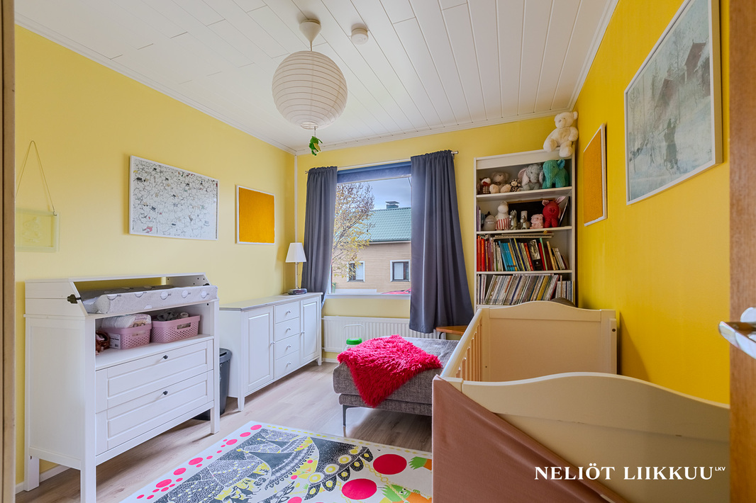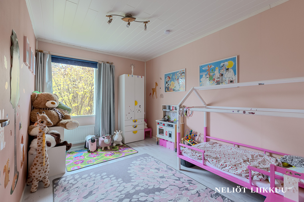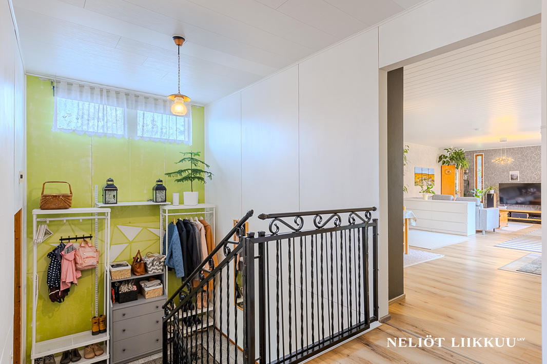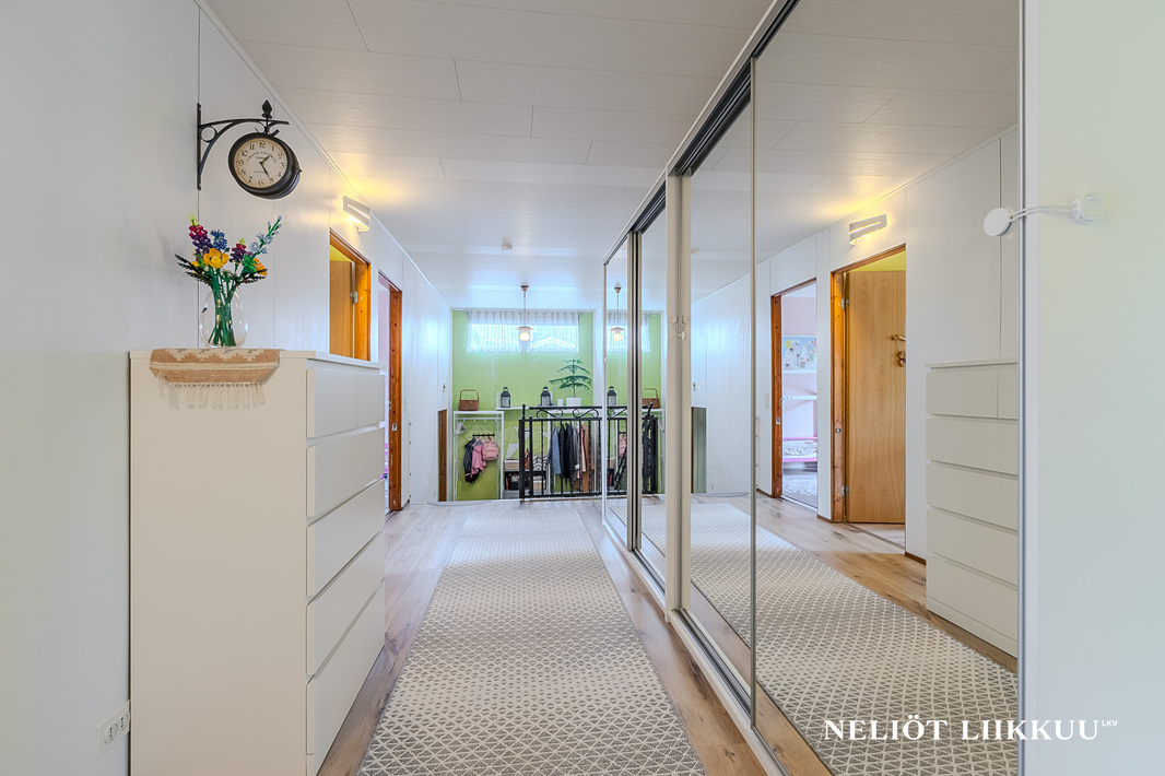 Yläkerrassa sijaitsee valoisa olohuone, keittiö, kolme makuuhuonetta, vaatehuone, erillinen wc sekä käytännöllinen eteistila. Selkeä pohjaratkaisu tekee arjesta sujuvaa ja tuo tilaa yhdessäololle sekä omaan rauhaan.