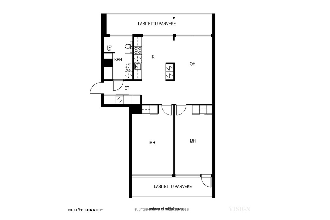 Kerrostalo 3h+avok+kph+2lasitettu parveke (yhtiöjärjestyksen mukaan 3h+kt+kh+p)
