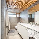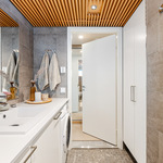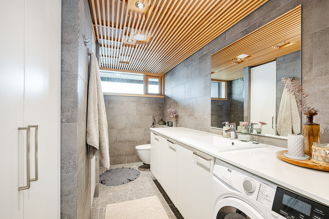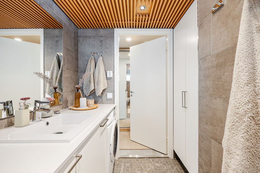 Eteisen yhteydessä omassa rauhassaan sijaitsee tilava ja ikkunallinen kylpyhuone. Kylpyhuoneessa on huomioitu niin peseytyminen kuin pyykkihuoltokin. Säilytys- ja laskutilaa on runsaasti.