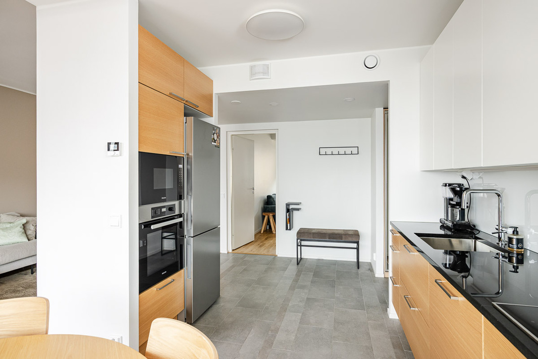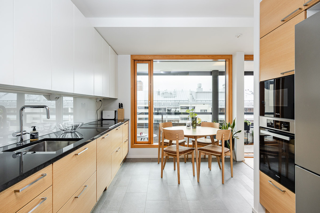 Keittiössä on täyspuiset kaapistot, Mielen laadukkaat kodinkoneet, kivitasot ja helppohoitoinen laattalattia. Ruokapöydälle on viihtyisä paikka ison ikkunan edessä.
