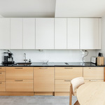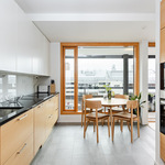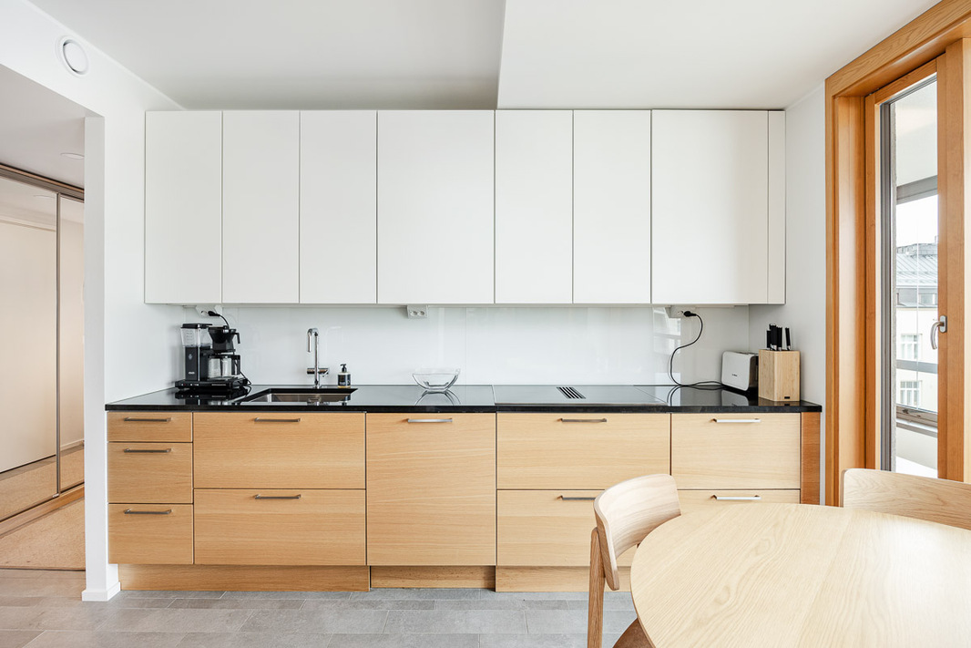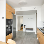 | Keittiön varustelu | Jääkaappi/pakastin, integroitu astianpesukone ja liesitaso, integroidulla liesituulettimella. Kalusteeseen upotetut pyrolyysi-kiertoilmauuni ja mikroaaltouuni. Työtasot kiveä. Mielen kodinkoneet. Välitila maalattua lasia ja LED-valaistus. Integroitu allas ja hana. Keittiön alakaapit ovat tammea ja yläkaapit matta valkoinen. Lattia laattaa ja seinät maalattu |