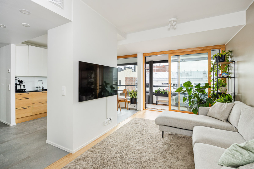 Keittiö ja olohuone yhdistyvät viihtyisäksi oleskelutilaksi, mistä on kulku lasitetulle parvekkeelle ilta-aurinkoon sisäpihan puolelle.
