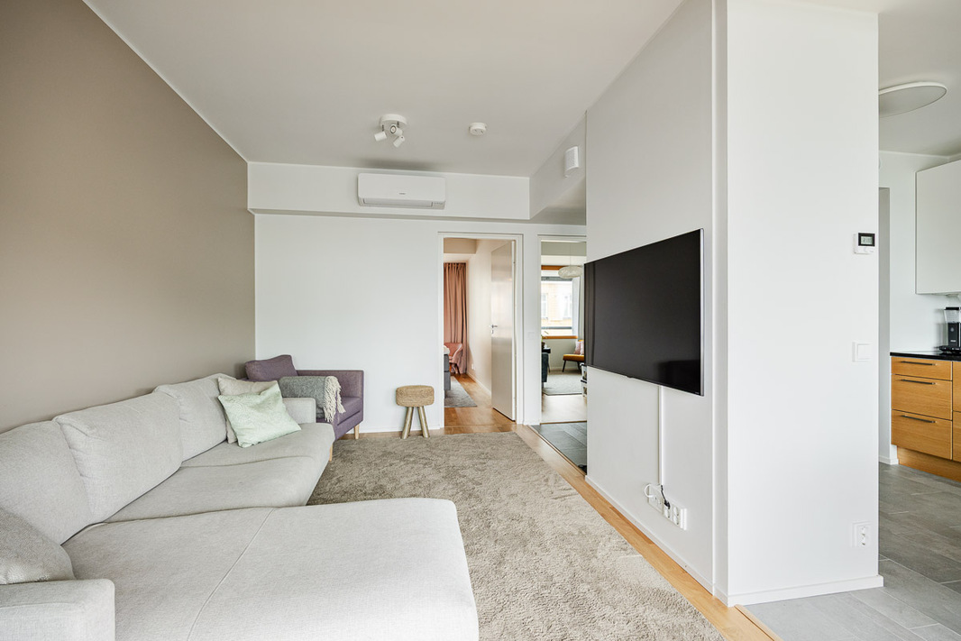 Asunnon lämmitys on toteutettu vesikiertoisena lattialämmityksenä, joten patteriton koti on helppo sisustaa. Huoneistokohtainen ilmanvaihto ja viilennys lisäävät asumismukavuutta vuoden ympäri.
