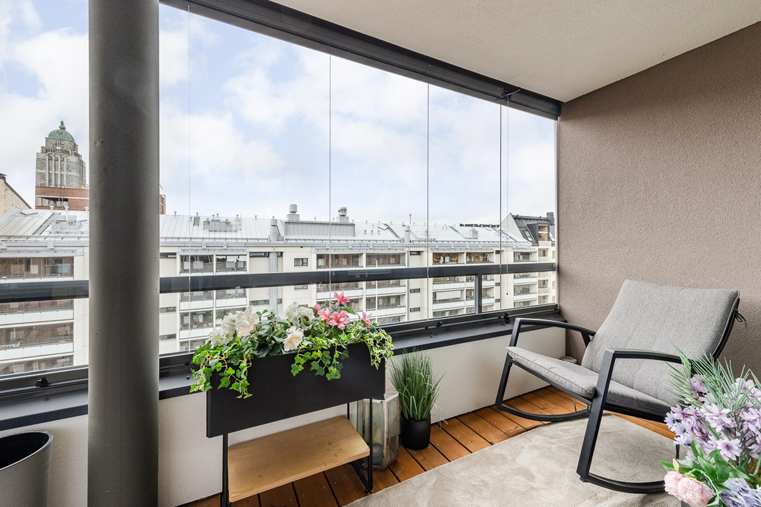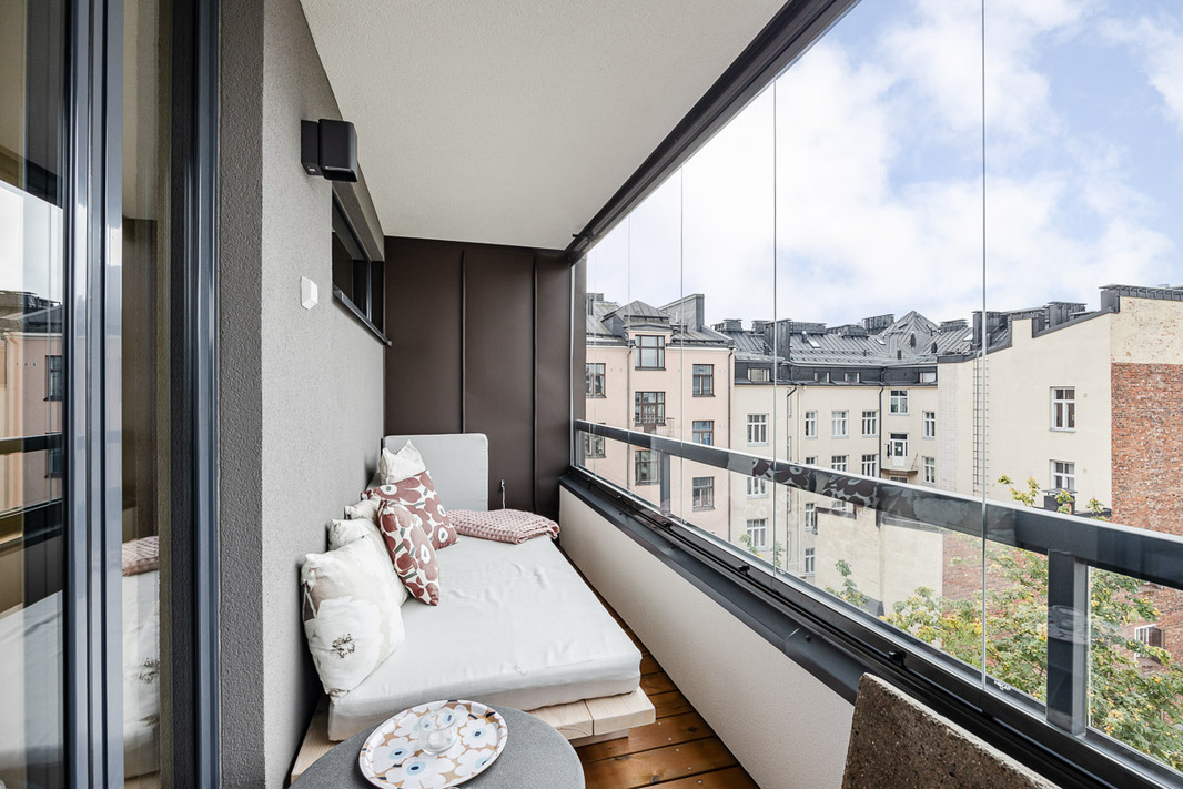 Kaksi lasitettua, huoneiston levyistä parveketta molemmin puolin asuntoa ovat kuin lisähuoneita keväästä syksyyn. Ne tuovat runsaasti luonnonvaloa jokaiseen huoneeseen.