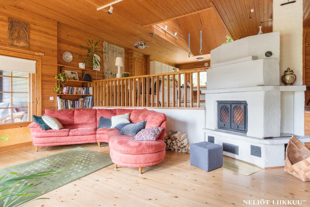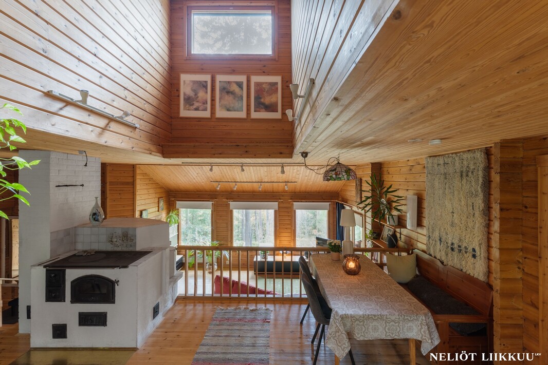Talo on rakennettu mäen rinteelle ja sitä ympäröivät suojaisat, rauhoittavan metsäiset maisemat. Siinä on korkeutta, avaruutta ja kerroksellisuutta. Sisälle tulee juuri sopivasti luonnonvaloa. Takka, hella ja leivinuuni tuovat lämpöä ja tunnelmaa, mutta myös tarvittaessa riippumattomuutta sähköstä lämmityksen ja ruoanlaiton suhteen. Kaikki makuuhuoneet ovat tilavia ja niissä on kaapistot valmiina. Talossa on jotain niin poikkeuksellista hyvää energiaa, että sitä ei voi sanoin selittää. Se on koettava!