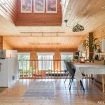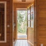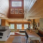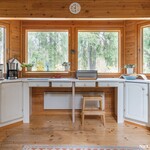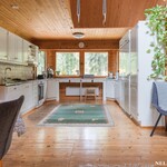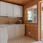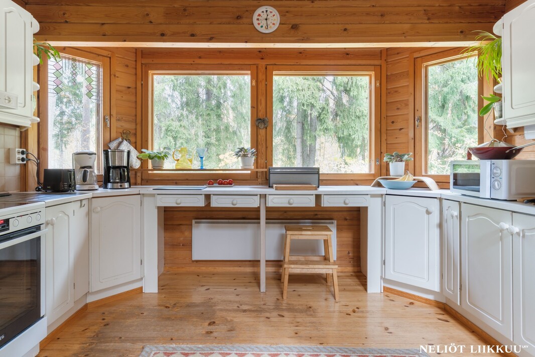 | Keittiön varustelu | Välitila laatoitettu. Lattiassa jonkin verran kulumaa. Keittiön ja ruokailutilan välissä on luukku, josta pääsee pieneen kellariin. Keittiöön tulee kauniisti valoa katon korotetun osan ikkunasta. Ikkunat on keittiössä erkkerimalliset, joten keittiöstä on kauniit näkymät luontoon. |