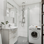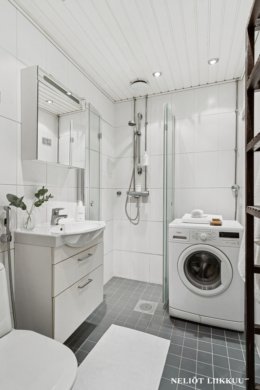 Kylpyhuone on hyvässä kunnossa, sillä se remontoitiin vuonna 2012 ja on varustettu pesukoneliitännällä sekä suihkuseinillä, jotka saat myös kaapiksi. Kodin lattioissa on mietitty toiminnallisuutta, sillä tuulikaapissa sekä keittiössä on laattalattiat ja laminaattia lattiat ovat eteisessä että makuu-/olohuoneessa. Muuttamaan pääsee halutessaan ilman remonttihuolia.