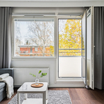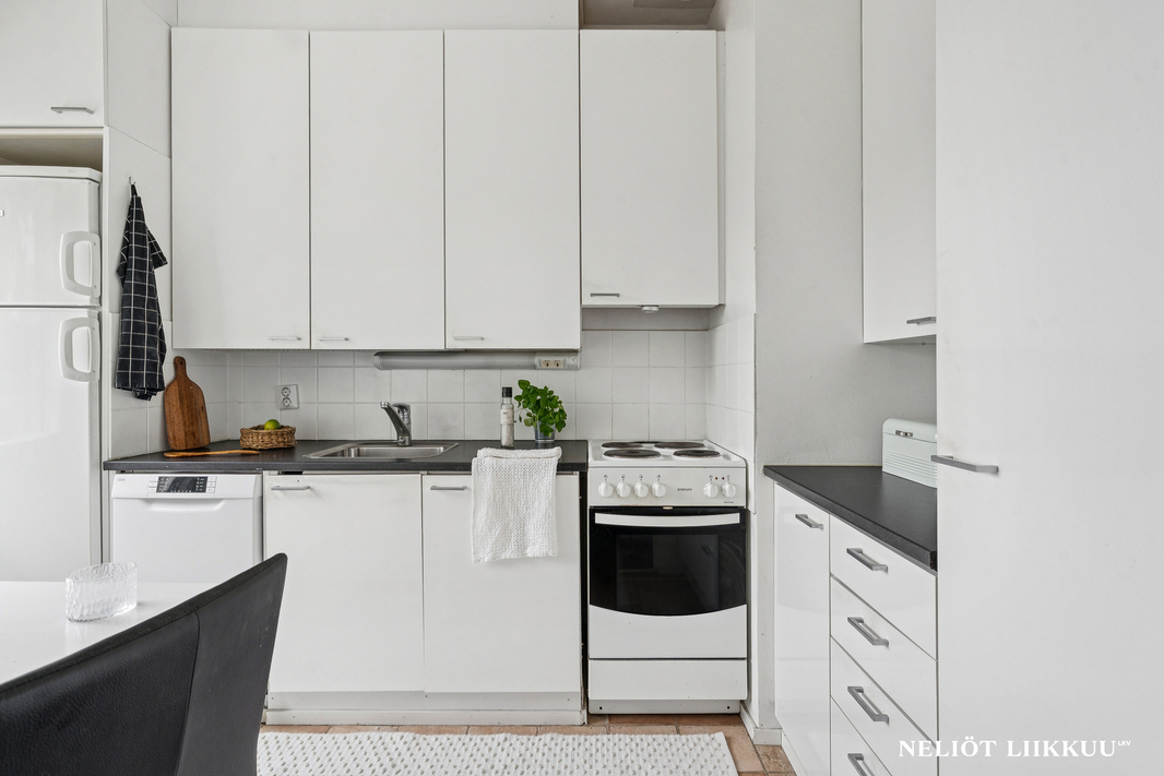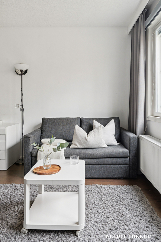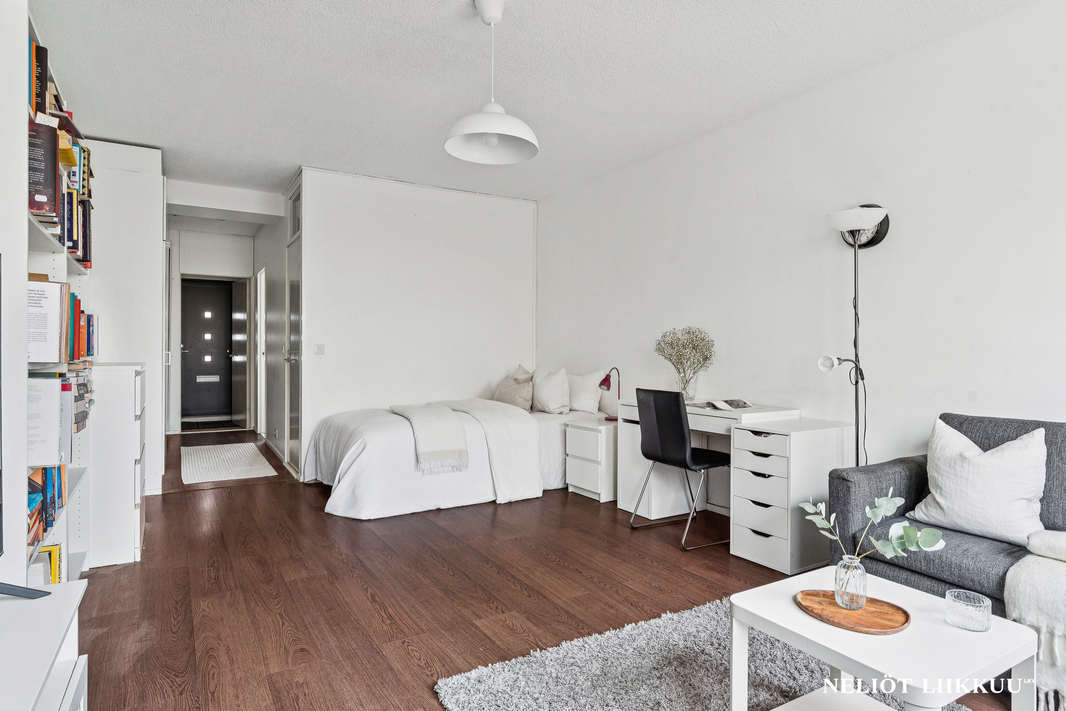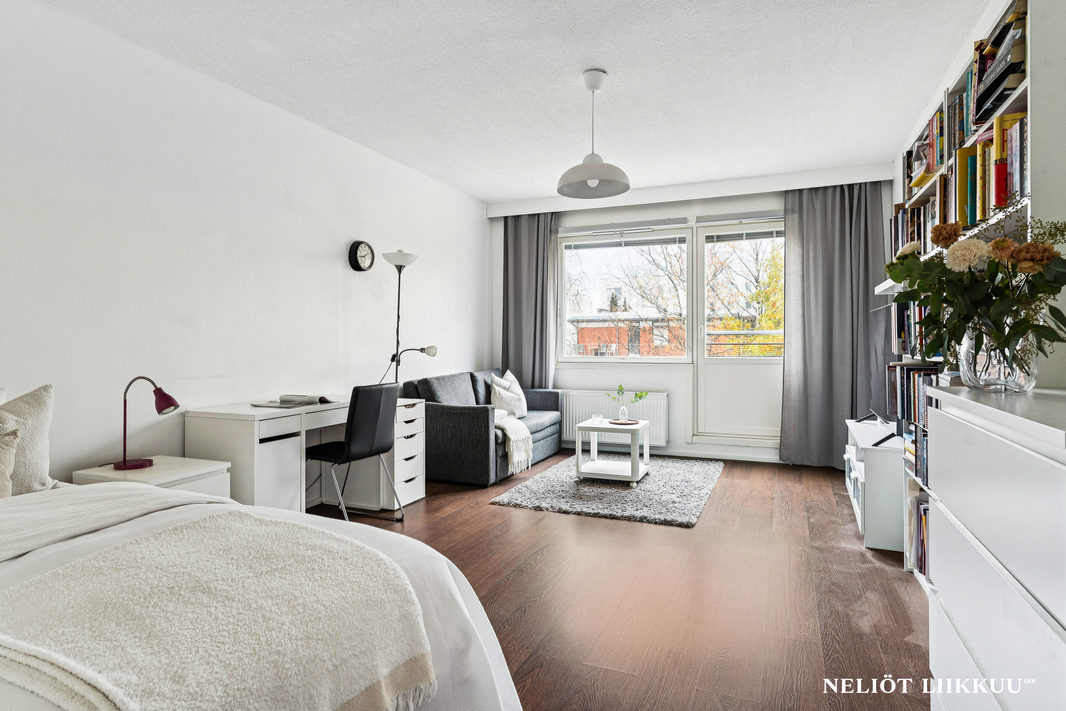 Kodissa neliöt ovat tehokkaasti käytössä ja tarjoavat monipuoliset tilat, joita arjen sujuvuuteen tarvitaan. Avarassa olohuoneessa/makuuhuoneessa on hyvin tilaa oleskelulle ja työpisteelle, ja ranskalaiselta parvekkeelta avautuvat vehreät näkymät. Keittiö on siisti ja käytännöllinen: uudet jääkaappi/pakastin ja keraaminen liesi ovat valmiita käyttöön (ne eroavat kuvista, sillä koneet on juuri tilattu) lisäksi mukavuutta lisäämässä on astianpesukone ja keittiössä on reilusti laskutilaa joten täällä todella kätevästi kokkailet tarvittavat.