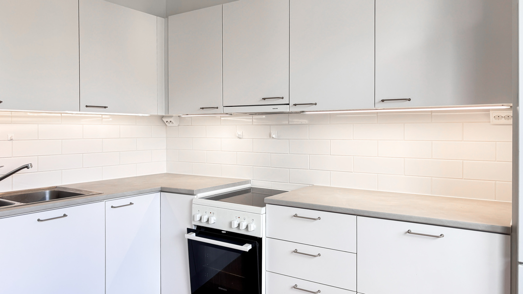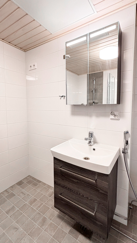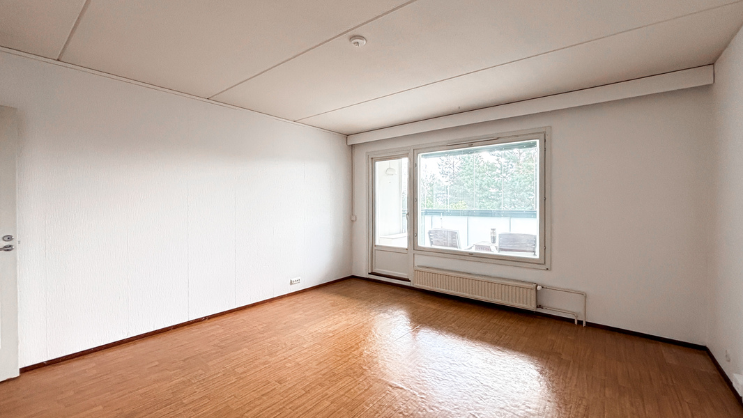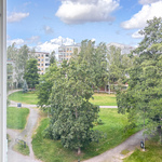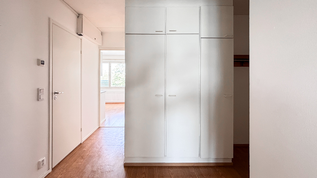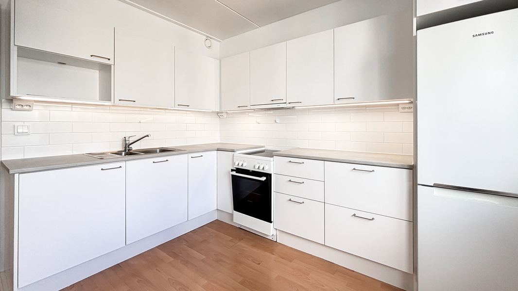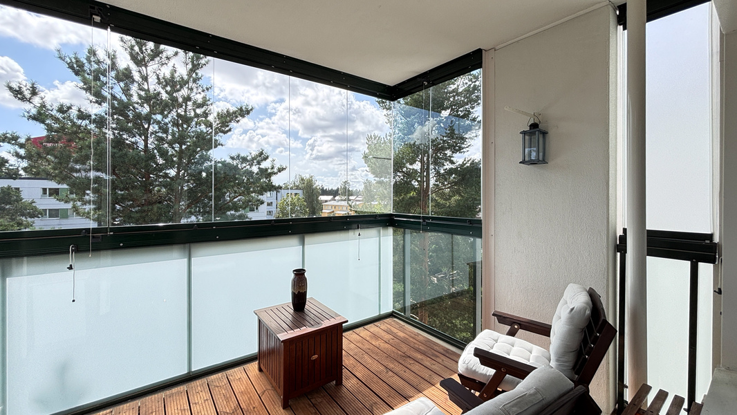Keittiö on saanut uuden ilmeen modernien kaapistojen, tyylikkäiden tasojen ja uusien kodinkoneiden myötä. Suuri makuuhuone tarjoaa runsaasti tilaa ja mukavuutta, ja avara, valoisa olohuone jatkuu lasitetulle parvekkeelle, joka on kuin oma pieni kesäolohuone. Käytännöllinen vaatehuone takaa hyvät säilytysratkaisut, ja tyylikkäästi remontoidussa kylpyhuoneessa on paikka pyykinpesukoneelle.